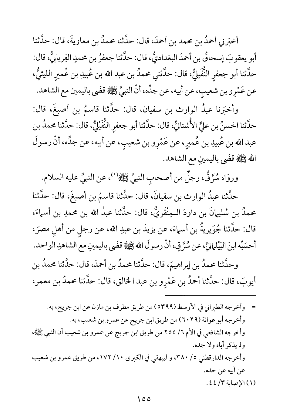 أخبَرني أحمدُ بن محمد بن أحمدَ، قال: حدَّثنا محمدُ بن معاويةَ، قال: حدَّثنا أبو يعقوبَ إسحاقُ بن أحمدَ البغداديُّ، قال: حدَّثنا جعفرُ بن محمدٍ الفِريابيُّ، قال: حدَّثنا أبو جعفرٍ النُّفيليُّ، قال: حدَّثني محمدُ بن عبد الله بن عُبيدِ بن عُميرٍ الليثيُّ، عن عَمْرِو بن شعيبٍ، عن أبيه، عن جدِّه، أنّ النبيَّ - صلى الله عليه وسلم - قضَى باليمين مع الشاهد.
