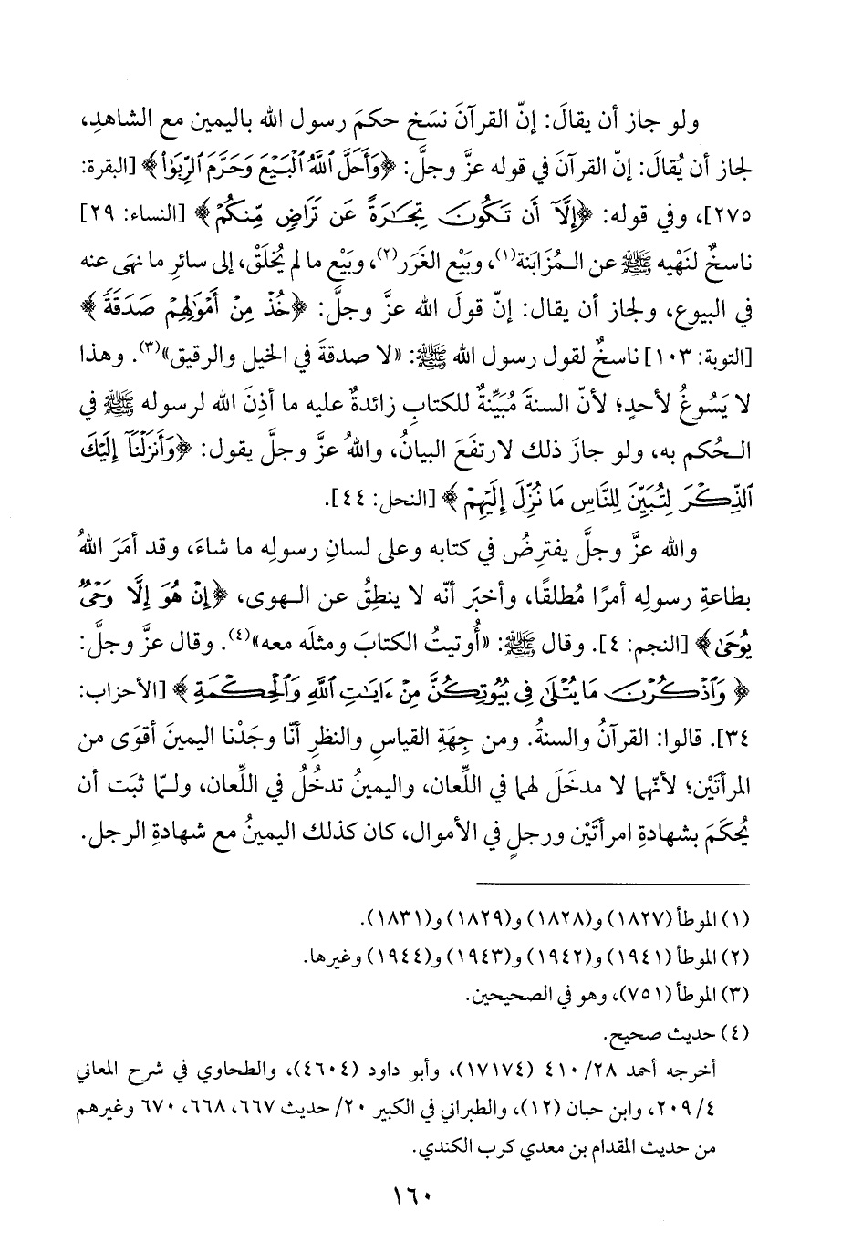 ولو جاز أن يقالَ: إنّ القرآنَ نسَخ حكمَ رسول الله باليمين مع الشاهدِ، لجاز أن يُقالَ: إنّ القرآنَ في قوله عزَّ وجلَّ: {وَأَحَلَّ اللَّهُ الْبَيْعَ وَحَرَّمَ الرِّبَا} [البقرة: ٢٧٥]، وفي قوله: {إِلَّا أَنْ تَكُونَ تِجَارَةً عَنْ تَرَاضٍ مِنْكُمْ} [النساء: ٢٩] ناسخٌ لنَهْيه - صلى الله عليه وسلم - عن المُزَابَنة (¬١)، وبَيعْ الغَرَر (¬٢)، وبَيعْ ما لم يُخلَقْ، إلى سائرِ ما نهَى عنه في البيوع، ولجاز أن يقال: إنّ قولَ الله عزَّ وجلَّ: {خُذْ مِنْ أَمْوَالِهِمْ صَدَقَةً} [التوبة: ١٠٣] ناسخٌ لقول رسول الله - صلى الله عليه وسلم -: "لا صدقةَ في الخيل والرقيق" (¬٣). وهذا لا يَسُوغُ لأحدٍ؛ لأنّ السنةَ مُبَيِّنةٌ للكتابِ زائدةٌ عليه ما أذِنَ الله لرسوله - صلى الله عليه وسلم - في الحُكم به، ولو جازَ ذلك لارتفَعَ البيانُ، واللّهُ عزَّ وجلَّ يقول: {وَأَنْزَلْنَا إِلَيْكَ الذِّكْرَ لِتُبَيِّنَ لِلنَّاسِ مَا نُزِّلَ إِلَيْهِمْ} [النحل: ٤٤].