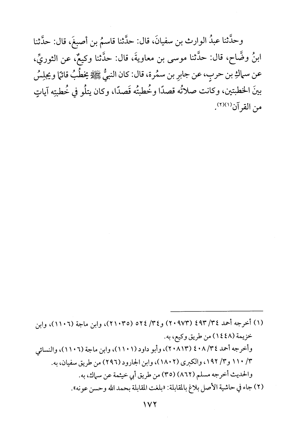 وحدَّثنا عبدُ الوارث بن سفيانَ، قال: حدَّثنا قاسمُ بن أصبغَ، قال: حدَّثنا ابنُ وضَّاح، قال: حدَّثنا موسى بن معاويةَ، قال: حدَّثنا وكيع، عن الثوريِّ، عن سماكِ بن حربٍ، عن جابرِ بن سمُرة، قال: كان النبيُّ - صلى الله عليه وسلم - يخطُبُ قائمًا ويجلِسُ بينَ الخطبتين، وكانت صلاتُه قصدًا وخُطبتُه قَصدًا، وكان يتلُو في خُطبتِه آياتٍ من القرآن (¬١) (¬٢).