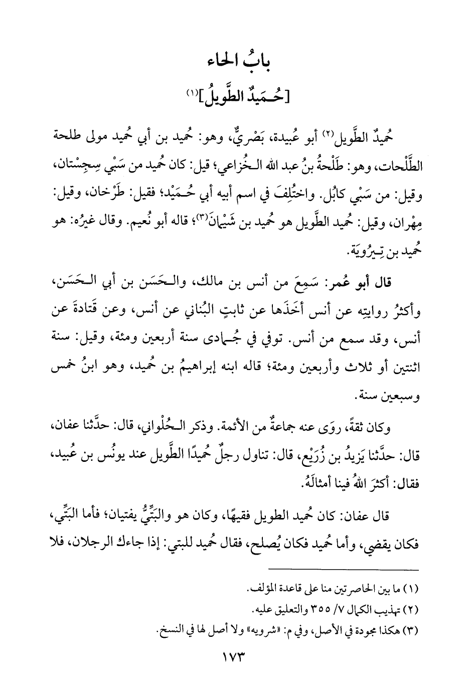 حُميدٌ الطَّويل (¬٢) أبو عُبيدة، بَصريٌّ، وهو: حُميد بن أبي حُميد مولى طلحة الطَّلْحات، وهو: طَلْحةُ بنُ عبد الله الخُزاعي؛ قيل: كان حُميد من سَبْي سِجِسْتان، وقيل: من سَبْي كابُل. واختُلِفَ في اسم أبيه أبي حُمَيْد؛ فقيل: طَرْخان، وقيل: مِهْران، وقيل: حُميد الطَّويل هو حُميد بن شَيْمانَ (¬٣)؛ قاله أبو نُعيم. وقال غيرُه: هو حُميد بن تِيرُوَيَة.