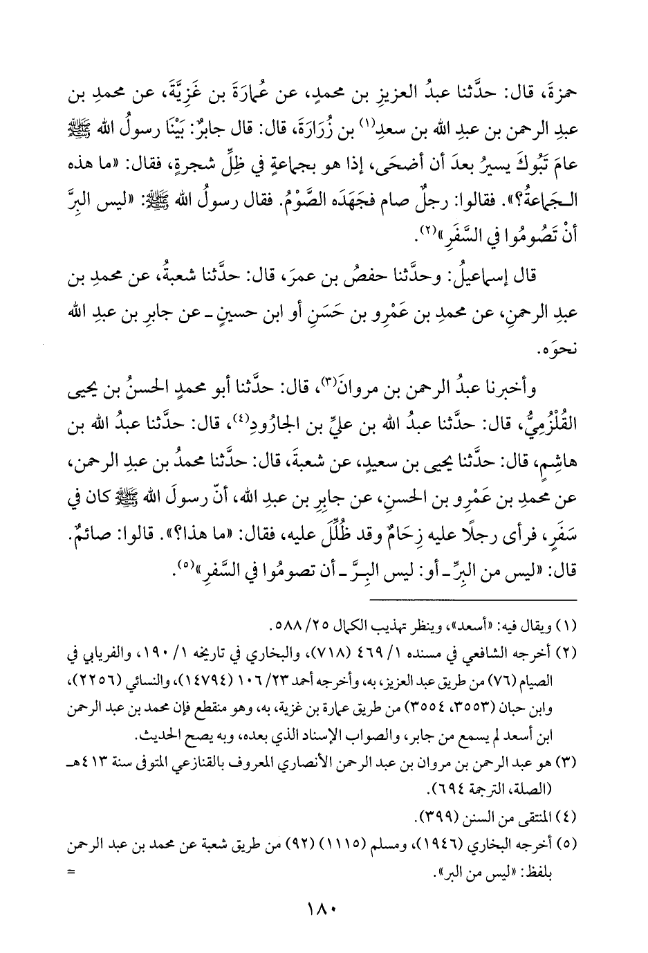وأخبرنا عبدُ الرحمن بن مروانَ (¬٣)، قال: حدَّثنا أبو محمدٍ الحسنُ بن يحيى القُلْزُمِيُّ، قال: حدَّثنا عبدُ الله بن عليِّ بن الجارُودِ (¬٤)، قال: حدَّثنا عبدُ الله بن هاشِمٍ، قال: حدَّثنا يحيى بن سعيدٍ، عن شعبةَ، قال: حدَّثنا محمدُ بن عبدِ الرحمن، عن محمدِ بن عَمْرِو بن الحسنِ، عن جابِرِ بن عبدِ الله، أنّ رسولَ الله - صلى الله عليه وسلم - كان في سَفَرٍ، فرأى رجلًا عليه زِحَامٌ وقد ظُلِّلَ عليه، فقال: "ما هذا؟ ". قالوا: صائمٌ. قال: "ليس من البِرِّ - أو: ليس البِرَّ - أن تصومُوا في السَّفرِ" (¬٥).