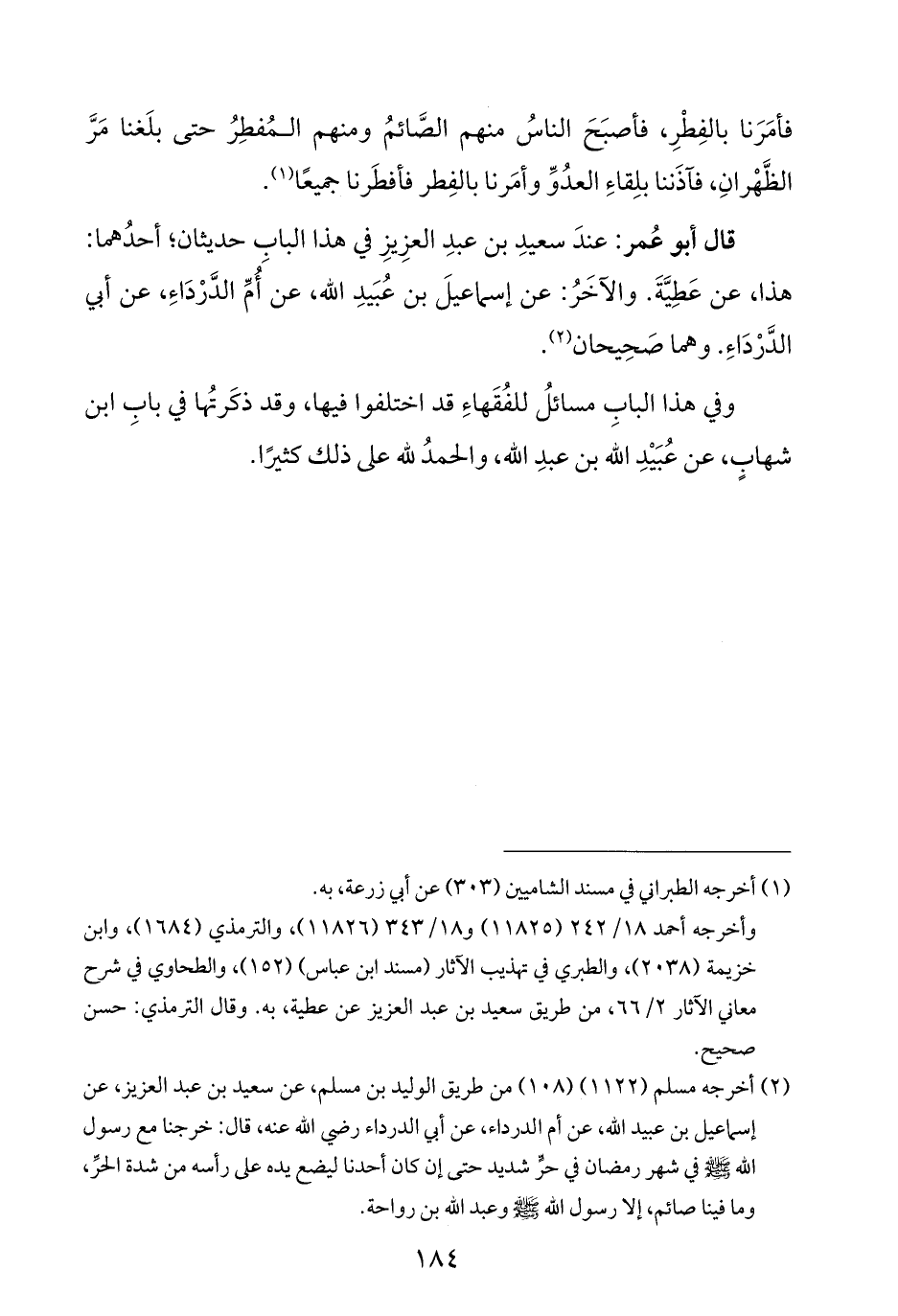 (¬٢) أخرجه مسلم (١١٢٢) (١٠٨) من طريق الوليد بن مسلم، عن سعيد بن عبد العزيز، عن إسماعيل بن عبيد الله، عن أم الدرداء، عن أبي الدرداء - رضي الله عنه -، قال: خرجنا مع رسول الله - صلى الله عليه وسلم - في شهر رمضان في حرٍّ شديد حتى إن كان أحدنا ليضع يده على رأسه من شدة الحرِّ، وما فينا صائم، إلا رسول الله - صلى الله عليه وسلم - وعبد الله بن رواحة.