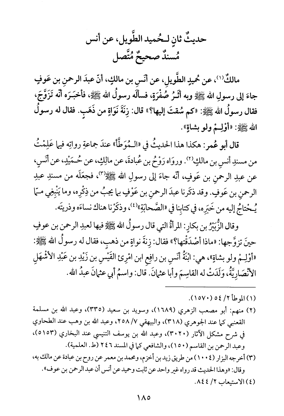 قال أبو عُمر: هكذا هذا الحديثُ في "المُوَطَّأ" عندَ جماعةِ رواتِه فيما عَلِمْتُ من مسندِ أنسِ بن مالكٍ (¬٢). وروَاه رَوْحُ بن عُبادةَ، عن مالِكٍ، عن حُمَيْدٍ، عن أنَسٍ، عن عبدِ الرحمنِ بن عَوفٍ، أنّه جاءَ إلى رسولِ الله - صلى الله عليه وسلم - (¬٣)، فجعَلَه من مسندِ عبدِ الرحمنِ بن عَوفٍ. وقد ذكَرنا عبدَ الرحمنِ بن عَوْفٍ بما يجبُ من ذِكْرِه، وما يَنْبِغِي ممّا يُحْتاجُ إليه من خَبَرِه، في كتابِنا في "الصَّحابَةِ" (¬٤)، وذكَرْنا هناك نساءَه وذريتَه.