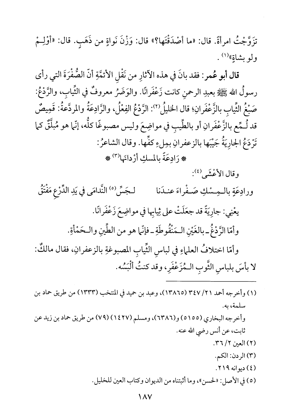 قال أبو عُمر: فقد بانَ في هذه الآثارِ من نَقْلِ الأئمَّةِ أنّ الصُّفْرَةَ التي رأى رسولُ الله - صلى الله عليه وسلم - بعبدِ الرحمنِ كانت زَعْفَرانًا. والوَضَرُ معروفٌ في الثِّيابِ، والرَّدعُ: صَبغ الثِّيابِ بالزَّعْفَرانِ، قال الخليلُ (¬٢): الرَّدْعُ الفِعْلُ، والرَّادِعَةُ والمردَّعةُ: قَمِيصٌ قد لُمِّع بالزَّعْفَرانِ أو بالطِّيبِ في مواضِعَ وليس مصبوغًا كلُّه، إنّما هو مُبلَّقٌ كما تَرْدَعُ الجارِيَةُ جَيْبَها بالزعفرانِ بمِلءِ كفِّها. وقال الشاعرُ: