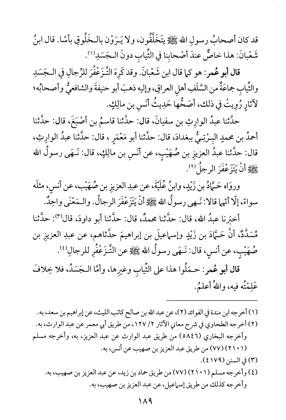 قال أبو عُمر: هو كما قال ابن شَعْبانَ. وقد كَرِهَ التَّزَعْفُرَ للرِّجالِ في الجَسَدِ والثِّيابِ جماعَة من السَّلَفِ أهلِ العراقِ، وإليه ذهبَ أبو حنيفةَ والشافعيُّ وأصحابُه؛ لآثارٍ رُوِيتْ في ذلك، أصَحُّها حَدِيثُ أَنَسِ بن مالِكٍ.