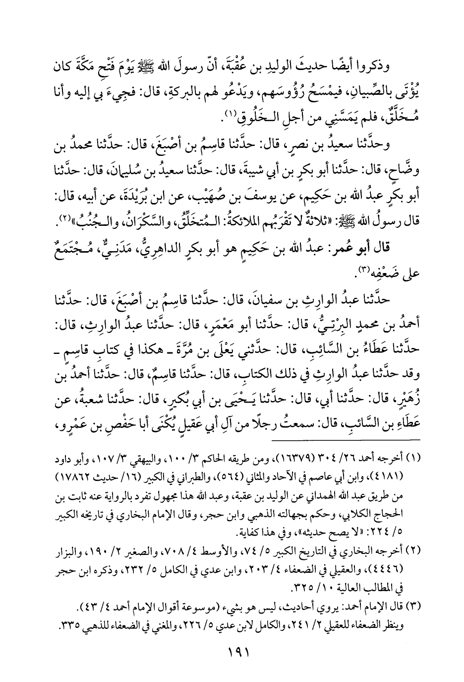 وحدَّثنا سعيدُ بن نصرٍ، قال: حدَّثنا قاسِمُ بن أصْبَغَ، قال: حدَّثنا محمدُ بن وضَّاحٍ، قال: حدَّثنا أبو بكرٍ بن أبي شيبةَ، قال: حدَّثنا سعيدُ بن سُليمانَ، قال: حدَّثنا أبو بكرٍ عبدُ الله بن حَكِيم، عن يوسفَ بن صُهَيْب، عن ابن بُرَيْدَةَ، عن أبيه، قال: قال رسولُ الله - صلى الله عليه وسلم -: "ثلاثةٌ لا تَقْرَبُهم الملائكةُ: المُتخَلِّقُ، والسَّكْرَانُ، والجُنُبُ" (¬٢).