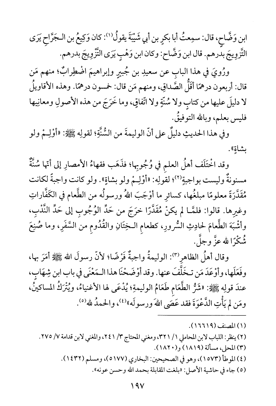 وقد اخْتَلَف أهلُ العلمِ في وُجُوبِها؛ فذَهَب فقهاءُ الأمصارِ إلى أنّها سُنَّةٌ مسنونةٌ وليست بواجبةٍ (¬٢)؛ لقولِه: "أوْلِمْ ولو بشاةٍ". ولو كانت واجبةً لكانت مُقَدَّرَةً معلومًا مبلغُها، كسائرِ ما أوْصط اللهُ ورسولُه من الطَّعام في الكَفَّاراتِ وغيرِها. قالوا: فلمَّا لم يكنْ مُقَدَّرًا خرَجَ من حَدِّ الوُجُوبِ إلى حَدِّ النَّدْبِ، وأشْبَهَ الطَّعامَ لحادِثِ السُّرورِ، كطعامِ الخِتَانِ والقُدُومِ من السَّفَرِ، وما صُنِعَ شُكْرًا لله عزَّ وجلَّ.