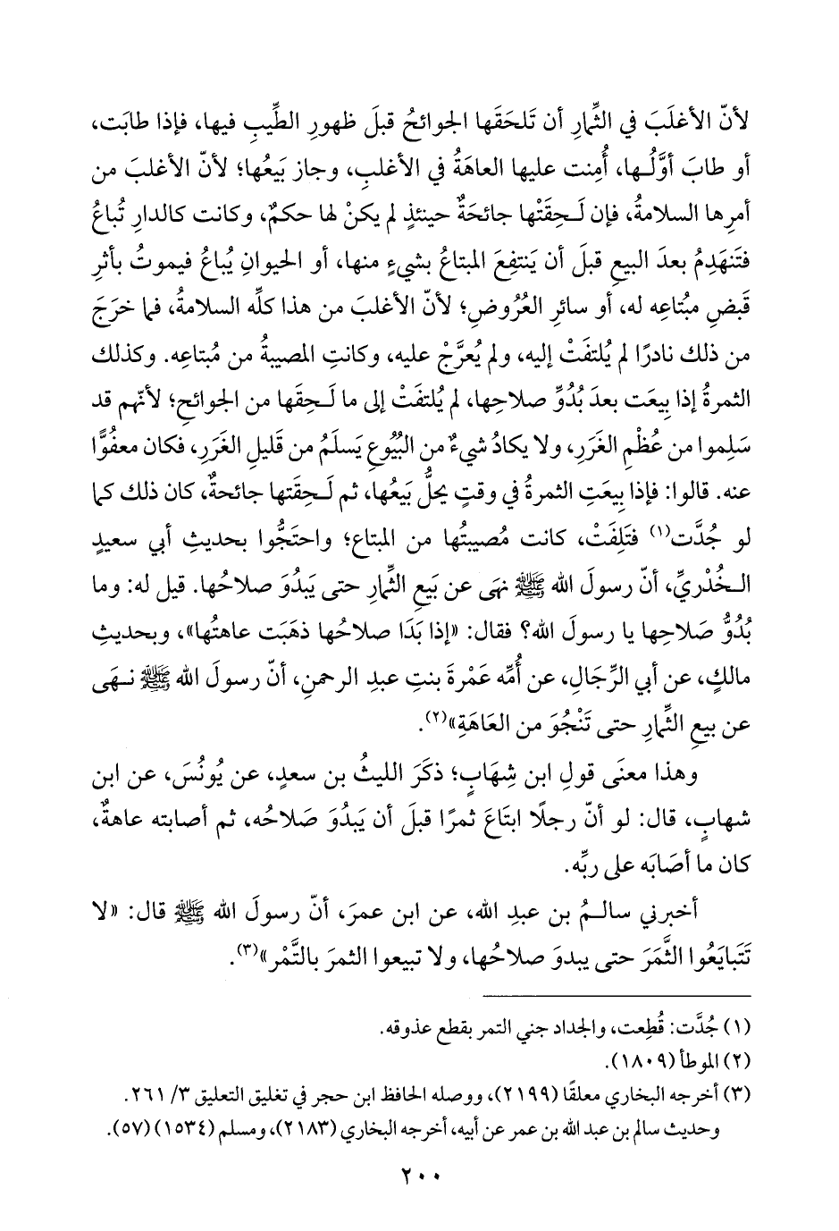 وهذا معنَى قولِ ابن شِهَابٍ؛ ذكَرَ الليثُ بن سعدٍ، عن يُونُسَ، عن ابن شهابِ، قال: لو أنّ رجلًا ابتَاعَ ثمرًا قبلَ أن يَبدُوَ صَلاحُه، ثم أصابته عاهةٌ، كان مَا أصَابَه على ربِّه.