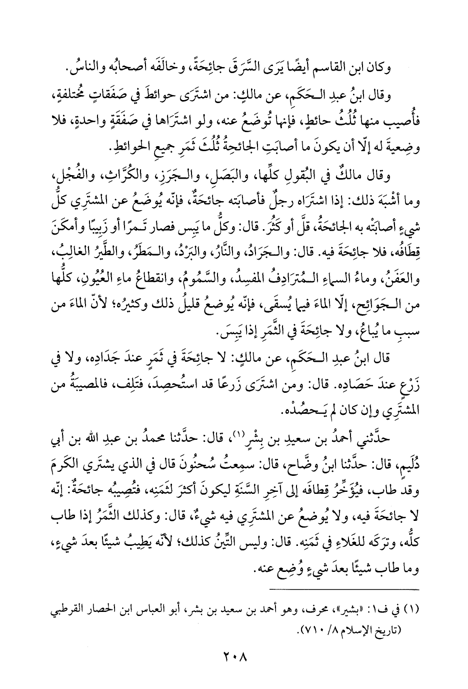 حدَّثني أحمدُ بن سعيدِ بن بِشْرٍ (¬١)، قال: حدَّثنا محمدُ بن عبدِ الله بن أبي دُلَيمٍ، قال: حدَّثنا ابنُ وضَّاح، قال: سمِعتُ سُحنُونَ قال في الذي يشتَري الكَرمَ وقد طاب، فيُؤَخِّرُ قِطافَه إلى آخِرِ السَّنَةِ ليكونَ أكثرَ لثَمَنِه، فتُصيبُه جائحَةٌ: إنّه لا جائحَةَ فيه، ولا يُوضعُ عن المشتَرِي فيه شيءٌ، قال: وكذلك الثَّمَرُ إذا طاب كلُّه، وترَكَه للغَلاءِ في ثَمَنِه. قال: وليس التِّينُ كذلك؛ لأنّه يَطِيبُ شيئًا بعدَ شيءٍ، وما طاب شيئًا بعدَ شيءٍ وُضِع عنه.