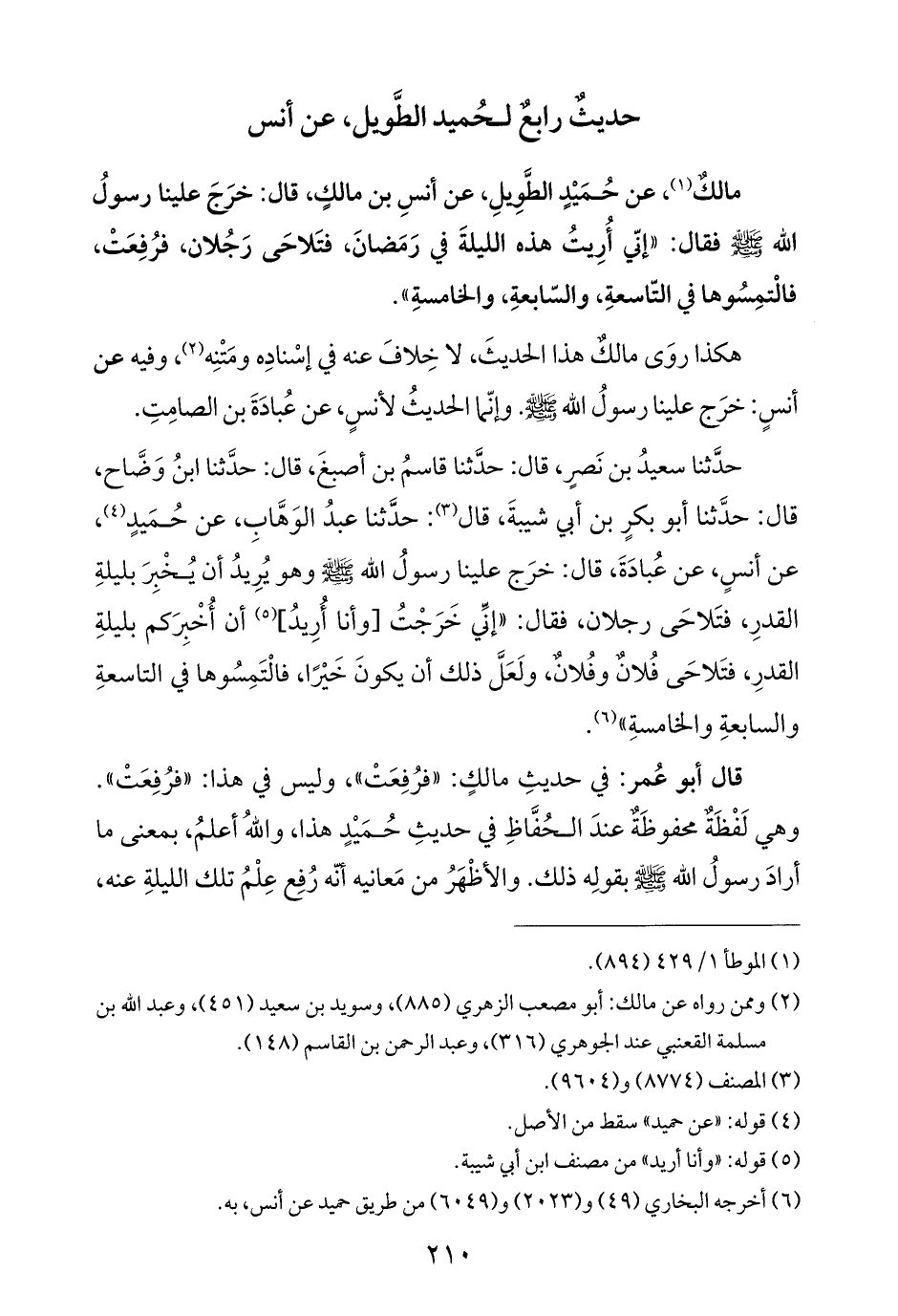 مالكٌ (¬١)، عن حُمَيْدٍ الطَّوِيلِ، عن أنسِ بن مالكٍ، قال: خرَجَ علينا رسولُ الله - صلى الله عليه وسلم - فقال: "إنِّي أُرِيتُ هذه الليلةَ في رَمَضانَ، فتَلاحَى رَجُلان، فرُفِعَتْ، فالْتمِسُوها في التّاسعةِ، والسّابعةِ، والخامسةِ".