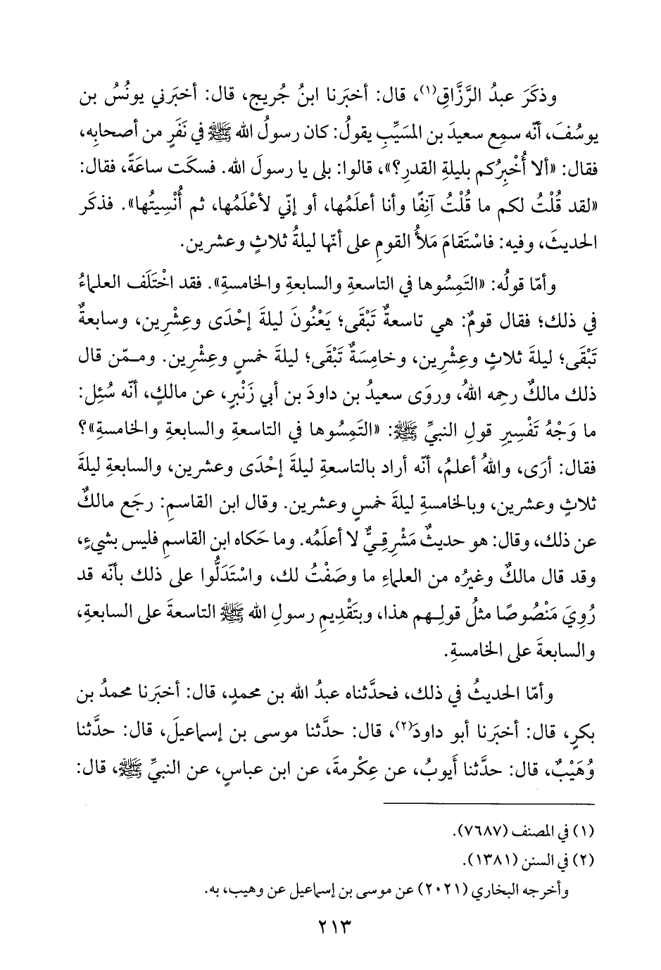 وذكَرَ عبدُ الرَّزَّاقِ (¬١)، قال: أخبَرنا ابنُ جُريج، قال: أخبَرني يونُسُ بن يوسُفَ، أنّه سمِع سعيدَ بن المسَيِّبِ يقولُ: كان رسولُ الله - صلى الله عليه وسلم - في نَفَرٍ من أصحابِه، فقال: "ألا أُخْبِرُكم بليلةِ القدرِ؟ "، قالوا: بلى يا رسولَ الله. فسكَت ساعَةً، فقال: "لقد قُلْتُ لكم ما قُلْتُ آنِفًا وأنا أعلَمُها، أو إنّي لأعْلَمُها، ثم أُنْسِيتُها". فذكَر الحديثَ، وفيه: فاسْتَقامَ مَلأُ القومِ على أنّها ليلةُ ثلاثٍ وعشرين.