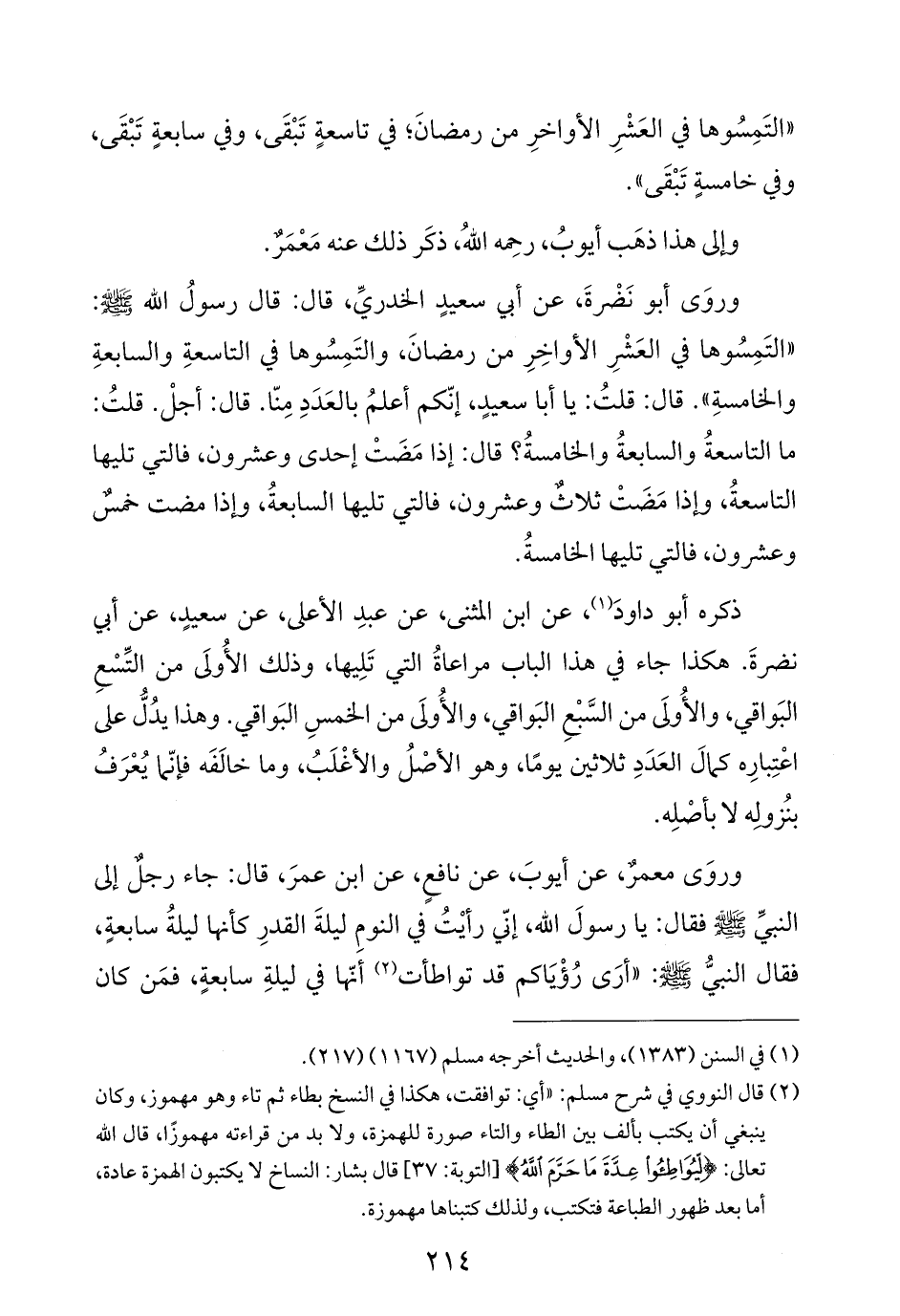 وروَى أبو نَضْرةَ، عن أبي سعيدٍ الخدريِّ، قال: قال رسولُ الله - صلى الله عليه وسلم -: "التَمِسُوها في العَشْرِ الأواخِرِ من رمضانَ، والتَمِسُوها في التاسعةِ والسابعةِ والخامسةِ". قال: قلتُ: يا أبا سعيدٍ، إنّكم أعلمُ بالعَدَدِ مِنّا. قال: أجلْ. قلتُ: ما التاسعةُ والسابعةُ والخامسةُ؟ قال: إذا مَضَتْ إحدى وعشرون، فالتي تليها التاسعةُ، وإذا مَضَتْ ثلاثٌ وعشرون، فالتي تليها السابعةُ، وإذا مضت خمسٌ وعشرون، فالتي تليها الخامسةُ.