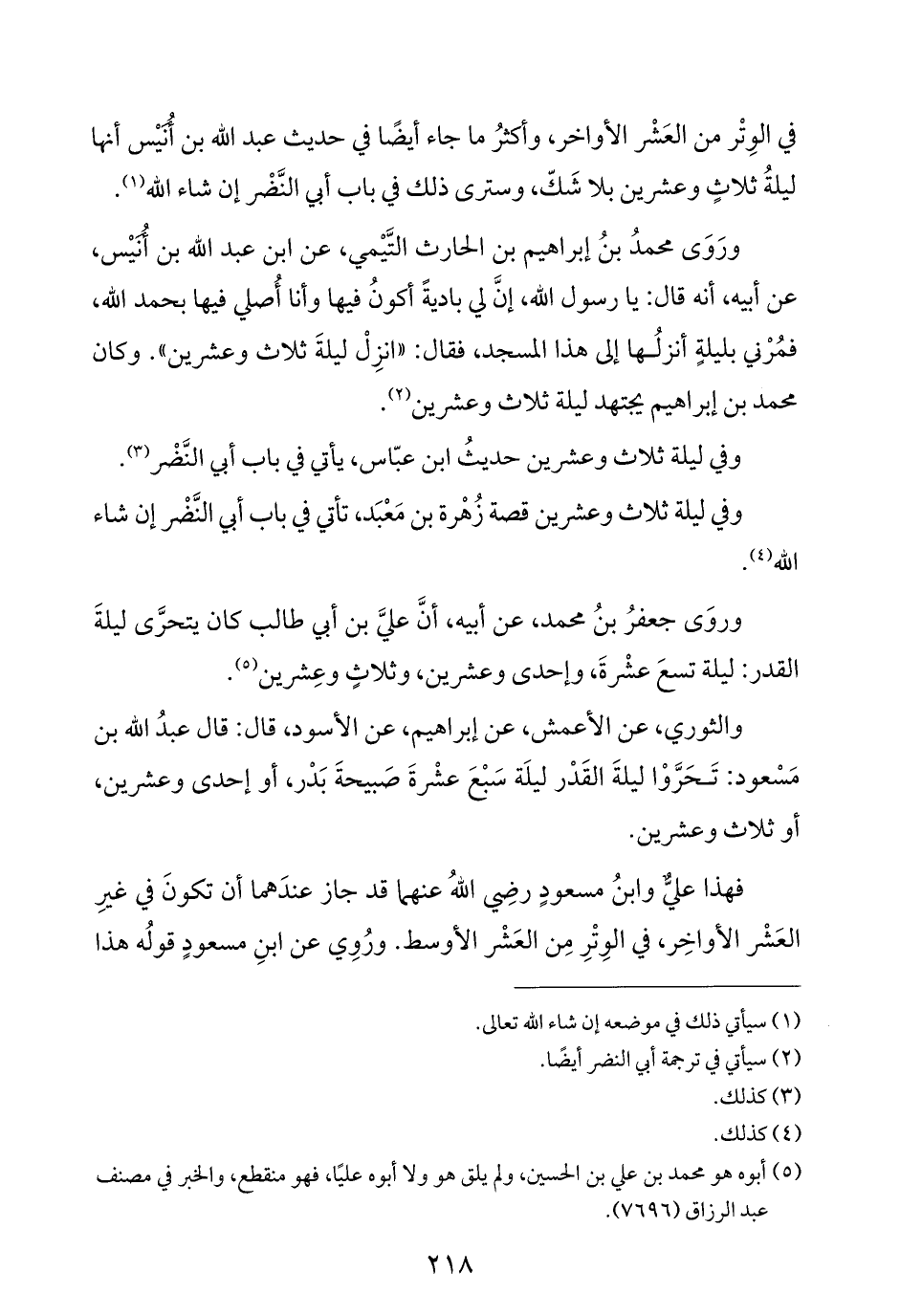 فهذا عليٌّ وابنُ مسعودٍ رضِي اللهُ عنهما قد جاز عندَهما أن تكونَ في غيرِ العَشْر الأواخِر، في الوِتْرِ مِن العَشْر الأوسط. ورُوِي عن ابنِ مسعودٍ قولُه هذا