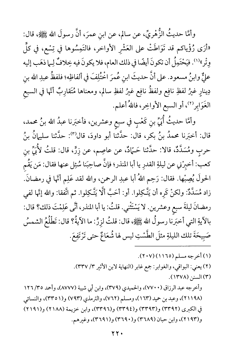 وأمَّا حديثُ أُبَيِّ بنِ كَعْبٍ في سبعٍ وعشرين، فأخبَرنا عبدُ الله بنُ محمد، قال: أخبَرنا محمدُ بنُ بكر، قال: حدَّثنا أبو داودَ، قال (¬٣): حدَّثنا سليمانُ بنُ حربٍ ومُسَدَّدٌ، قالا: حدَّثنا حَمّادٌ، عن عاصِم، عن زِرٍّ، قال: قلتُ لأُبَيِّ بنِ كعب: أخبِرْني عن ليلةِ القدرِ يا أبا المنذر؛ فإنَّ صاحِبَنا سُئِل عنها فقال: مَن يَقُمِ الحولَ يُصِبْها. فقال: رَحِم اللهُ أبا عبدِ الرحمن، والله لقد عَلِم أنَّها في رمضانَ. زاد مُسَدَّدٌ: ولكنْ كَرِه أن يَتَّكِلوا. أو: أحَبَّ ألَّا يَتَّكِلوا. ثم اتَّفقا: والله إنَّها لفي رمضانَ ليلةَ سبعٍ وعشرين. لا يَسْتَثْني. قلتُ: يا أبا المنذر، أنَّى عَلِمْتَ ذلك؟ قال: بالآيةِ التي أخبَرنا رسولُ الله - صلى الله عليه وسلم -، قال: قلتُ لزِرٍّ: ما الآيةُ؟ قال: تَطْلُعُ الشمسُ صَبِيحَةَ تلك الليلةِ مثلَ الطَّسْتِ ليس لها شُعَاعٌ حتى تَرْتَفِعَ.
