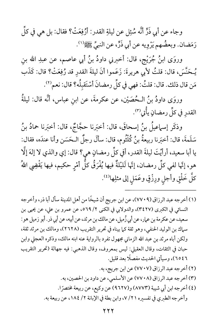 وروَى ابنُ جُرَيْج، قال: أخبرني داودُ بنُ أبي عاصم، عن عبدِ الله بنِ يُحَنَّسَ، قال: قلتُ لأبي هريرةَ: زَعَموا أنَّ ليلةَ القدرِ قد رُفِعَتْ؟ قال: كَذَب مَن قال ذلك. قال: قلتُ: فهي في كلِّ رمضانَ أسْتَقبِلُه؟ قال: نعم (¬٢).