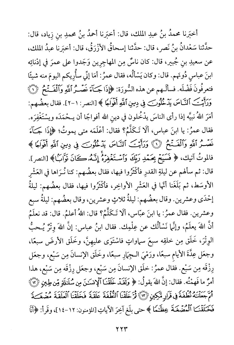 أخبَرنا محمدُ بنُ عبدِ الملك، قال: أخبَرنا أحمدُ بنُ محمدِ بنِ زِياد، قال: حدَّثنا سَعْدانُ بنُ نَصر، قال: حدَّثنا إسحاقُ الأزْرَقُ، قال: أخبَرنا عبدُ الملك، عن سعيدِ بنِ جُبير، قال: كان ناسٌ مِن المهاجِرِين وَجَدوا على عمرَ في إدْنائِه ابنَ عباسٍ دُونَهم. قال: وكان يَسْألُه، فقال عمرُ: أمَا إنِّي سأُرِيكم اليومَ منه شيئًا فتعرفُونَ فَضْلَه. فسألَهم عن هذه السُّورَة: {إِذَا جَاءَ نَصْرُ اللَّهِ وَالْفَتْحُ (١) وَرَأَيْتَ النَّاسَ يَدْخُلُونَ فِي دِينِ اللَّهِ أَفْوَاجًا} [النصر: ١ - ٢]. فقال بعضُهم: أمَرَ اللهُ نبيَّه إذا رأى الناسَ يدْخُلون في دينِ الله أفواجًا أن يحْمَدَه ويسْتَغْفِرَه. فقال عمرُ: يا ابنَ عباس، ألَا تَكَلَّمُ؟ فقال: أعْلَمَه متى يموتُ؛ {إِذَا جَاءَ نَصْرُ اللَّهِ وَالْفَتْحُ (١) وَرَأَيْتَ النَّاسَ يَدْخُلُونَ فِي دِينِ اللَّهِ أَفْوَاجًا} فالموتُ آتيك، {فَسَبِّحْ بِحَمْدِ رَبِّكَ وَاسْتَغْفِرْهُ إِنَّهُ كَانَ تَوَّابًا} [النصر]. قال: ثم سألهم عن ليلةِ القدرِ فأكْثَرُوا فيها، فقال بعضُهم: كنا نُرَاها في العَشْرِ الأوسَط، ثم بَلَغَنا أنَّها في العَشْرِ الأواخِر، فأكْثَرُوا فيها، فقال بعضُهم: ليلةُ إحْدَى وعشرين. وقال بعضهم: ليلةُ ثلاثٍ وعشرين، وقال بعضُهم: ليلةُ سبع وعشرين. فقال عمرُ: يا ابنَ عبّاس، ألَا تَكَلَّمُ؟ قال: اللهُ أعلمُ. قال: قد نعلَمُ أنَّ اللهَ يعلَمُ، وإنَّما نَسْألُك عن عِلْمِك. فقال ابنُ عباس: إنَّ اللهَ وِتْرٌ يُحبُّ الوِتْرَ، خَلَق مِن خلقِه سبعَ سماواتٍ فاسْتَوَى عليهِنَّ، وخَلَق الأرضَ سبعًا، وجعَل عِدآلأيامِ سبعًا، ورَمْيَ الجِمَارِ سبعًا، وخَلَق الإنسانَ مِن سَبعْ، وجعَل رِزْقَه مِن سَبْع. فقال عمرُ: خلَق الإنسانَ مِن سَبعْ، وجعَل رِزْقَه مِن سَبْع، هذا أمرٌ ما فَهمْتُه. فقال: إنَّ اللهَ يقولُ: {وَلَقَدْ خَلَقْنَا الْإِنْسَانَ مِنْ سُلَالَةٍ مِنْ طِينٍ (١٢) ثُمَّ جَعَلْنَاهُ نُطْفَةً فِي قَرَارٍ مَكِينٍ (١٣) ثُمَّ خَلَقْنَا النُّطْفَةَ عَلَقَةً فَخَلَقْنَا الْعَلَقَةَ مُضْغَةً فَخَلَقْنَا الْمُضْغَةَ عِظَامًا} حتى بلَغ آخِرَ الآياتِ [المؤمنون: ١٢ - ١٤]، وقَرأ: {أَنَّا