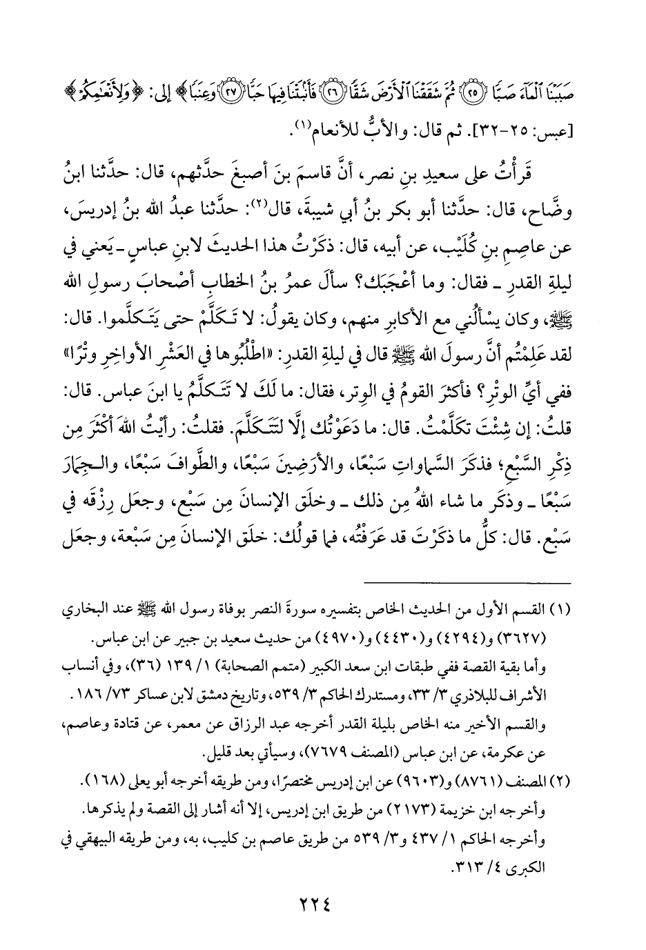 قَرأْتُ على سعيدِ بنِ نصر، أنَّ قاسمَ بنَ أصبغَ حدَّثهم، قال: حدَّثنا ابنُ وضَّاح، قال: حدَّثنا أبو بكر بنُ أبي شيبةَ، قال (¬٢): حدَّثنا عبدُ الله بنُ إدريسَ، عن عاصِمِ بنِ كُلَيْب، عن أبيه، قال: ذكَرْتُ هذا الحديثَ لابنِ عباسٍ - يَعني في ليلةِ القدرِ - فقال: وما أعْجَبَك؟ سألَ عمرُ بنُ الخطاب أصْحابَ رسولِ الله - صلى الله عليه وسلم -، وكان يسْألُني مع الأكابرِ منهم، وكان يقولُ: لا تَكَلَّمْ حتى يَتَكلَّموا. قال: لقد عَلِمْتُم أنَّ رسولَ الله - صلى الله عليه وسلم - قال في ليلةِ القدرِ: "اطْلُبُوها في العَشْرِ الأواخِرِ وتْرًا" ففي أيِّ الوتْرِ؟ فأكثرَ القومُ في الوِتر، فقال: ما لَكَ لا تَتَكلَّمُ يا ابنَ عباس. قال: قلتُ: إن شِئْتَ تكَلَّمْتُ. قال: ما دَعَوْتُك إلَّا لتَتَكَلَّمَ. فقلتُ: رأيْتُ اللهَ أكْثَرَ مِن ذِكْرِ السَّبع؛ فذكَرَ السَّماواتِ سَبْعًا، والأرَضِينَ سَبْعًا، والطَّوافَ سَبْعًا، والجِمَارَ سَبْعًا - وذكَر ما شاء اللهُ مِن ذلك - وخلَق الإنسانَ مِن سَبْع، وجعَل رِزْقَه في سَبْع. قال: كلُّ ما ذكَرْتَ قد عَرَفْتُه، فما قولُك: خلَق الإنسانَ مِن سَبْعة، وجعَل