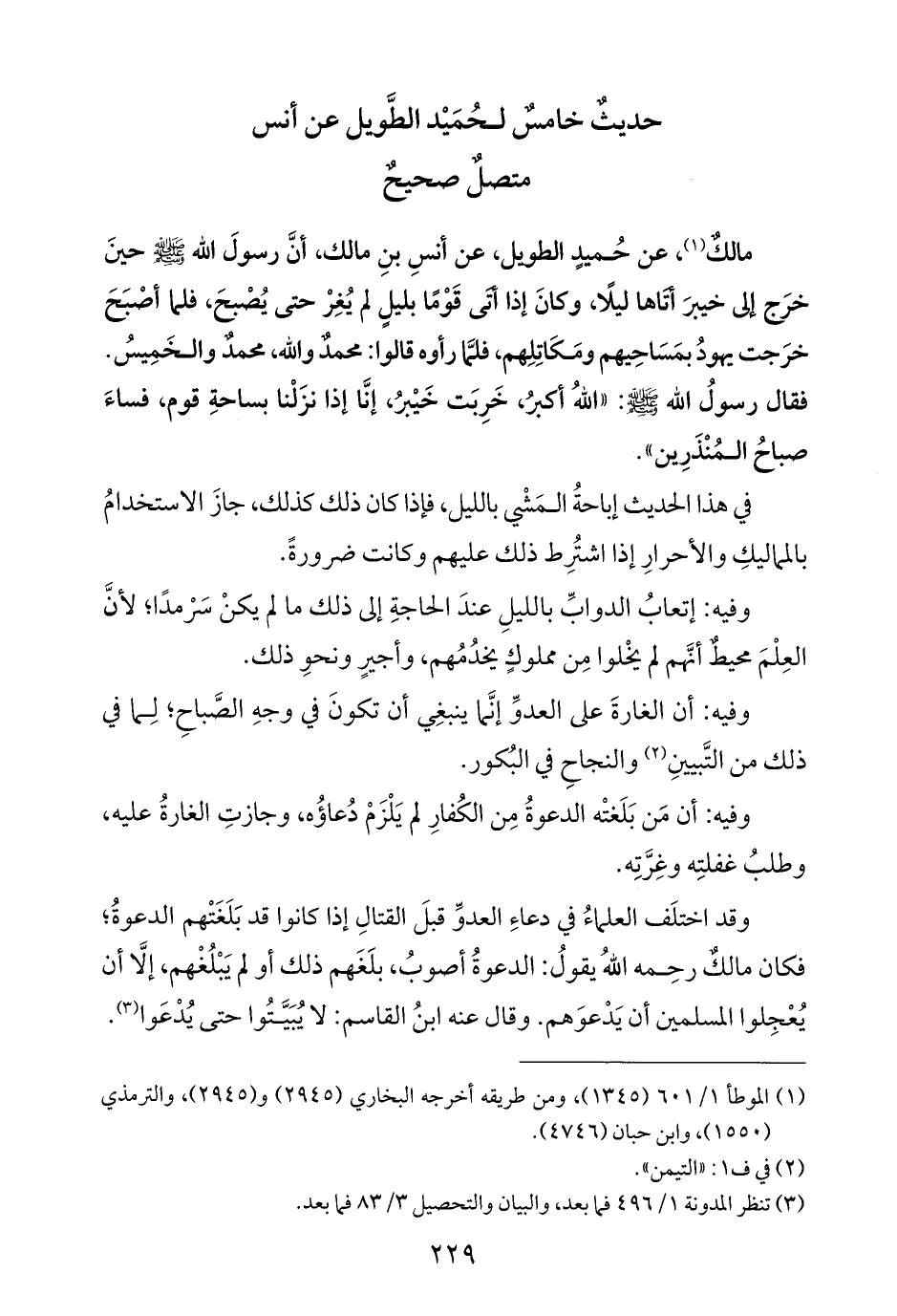مالكٌ (¬١)، عن حُميدٍ الطويل، عن أنسِ بنِ مالك، أنَّ رسولَ الله - صلى الله عليه وسلم - حينَ خرَج إلى خيبرَ آتَاها ليلًا، وكانَ إذا أتَى قَوْمًا بليلٍ لم يُغِرْ حتى يُصْبحَ، فلما أصْبَحَ خرَجت يهودُ بمَسَاحِيهم ومَكَاتِلِهم، فلما رأوه قالوا: محمدٌ والله، محمدٌ والخَمِيسُ. فقال رسولُ الله - صلى الله عليه وسلم -: "اللهُ أكبرُ، خَرِبَت خَيْبرُ، إنَّا إذا نزَلْنا بساحةِ قوم، فساءَ صباحُ المُنْذَرِين".