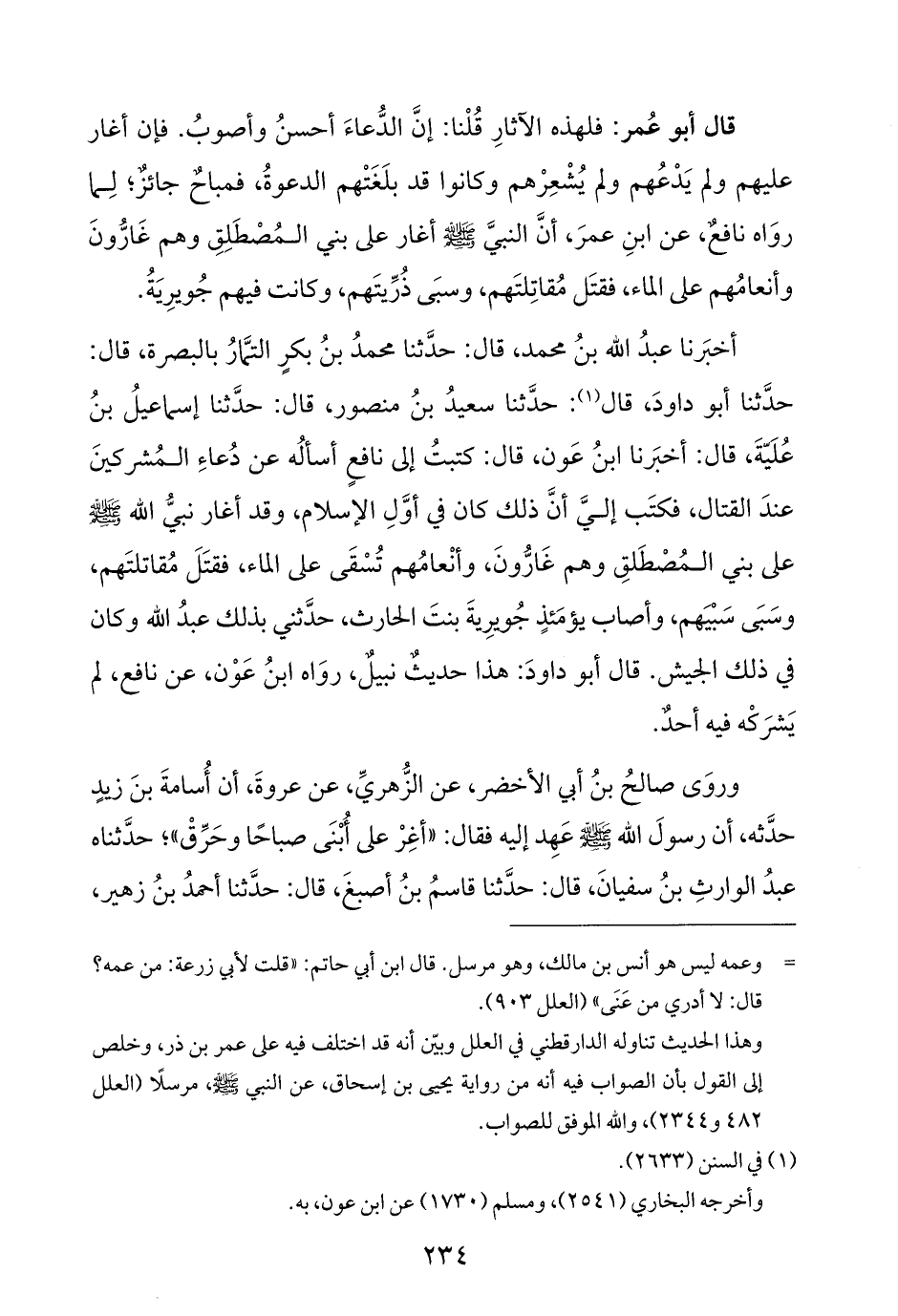 قال أبو عُمر: فلهذه الآثارِ قُلْنا: إنَّ الدُّعاءَ أحسنُ وأصوبُ. فإن أغار عليهم ولم يَدْعُهم ولم يُشْعِرْهم وكانوا قد بلَغَتْهم الدعوةُ، فمباحٌ جائزٌ؛ لِما روَاه نافعٌ، عن ابنِ عمرَ، أنَّ النبيَّ - صلى الله عليه وسلم - أغار علي بني المُصْطَلِقِ وهم غَارُّونَ وأنعامُهم على الماء، فقتَل مُقاتِلتَهم، وسبَى ذُرِّيتَهم، وكانت فيهم جُويرِيَةُ.