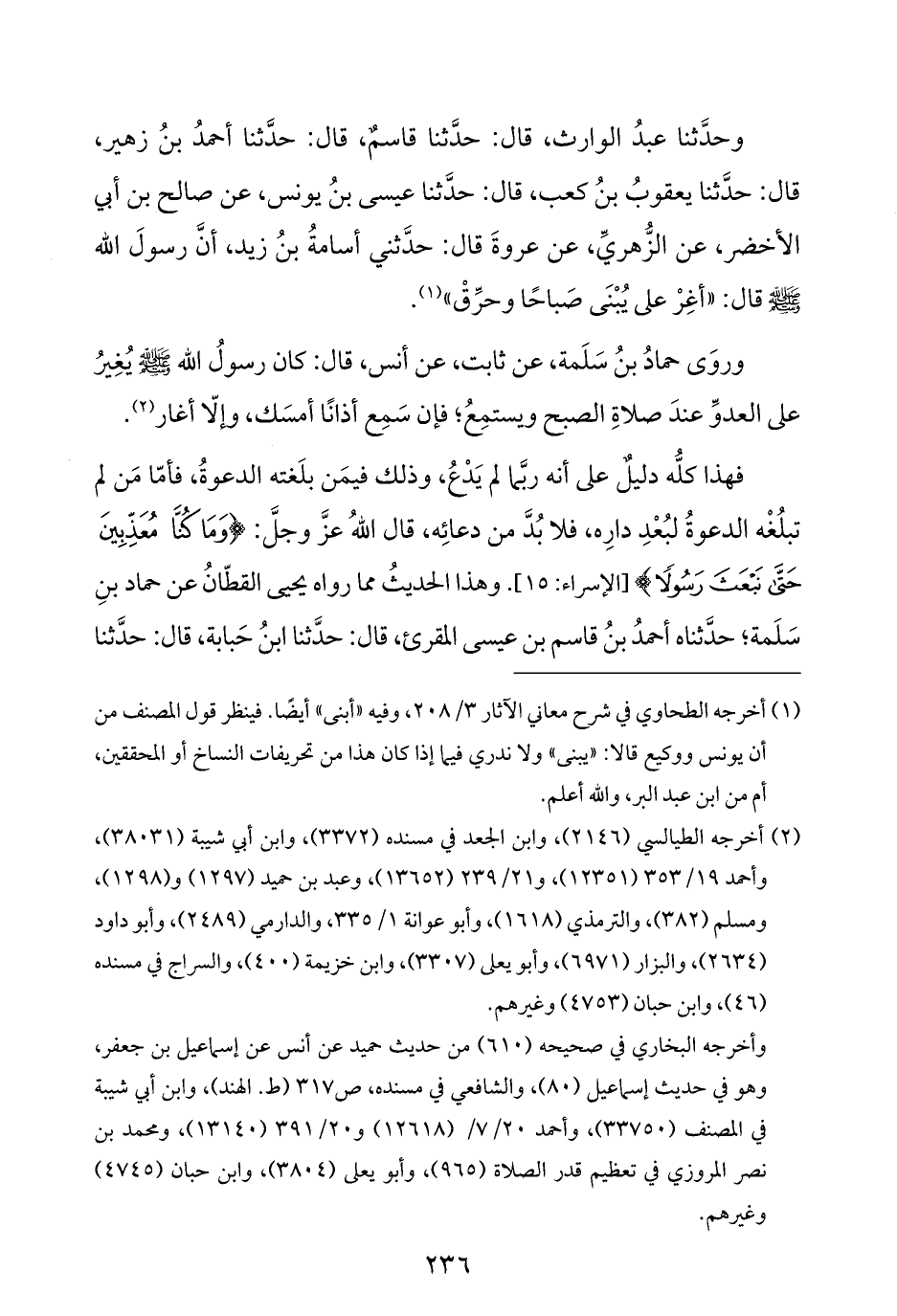 وروَى حمادُ بنُ سَلَمة، عن ثابت، عن أنس، قال: كان رسولُ الله - صلى الله عليه وسلم - يُغِيرُ على العدوِّ عندَ صلاةِ الصبح ويستمِعُ؛ فإن سَمِع أذانًا أمسَك، وإلّا أغار (¬٢).