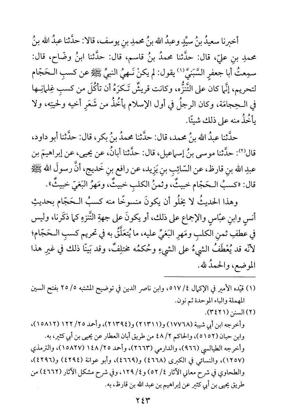 حدَّثنا عبدُ الله بنُ محمد، قال: حدَّثنا محمدُ بنُ بكر، قال: حدَّثنا أبو داود، قال (¬٢): حدَّثنا موسى بنُ إسماعيل، قال: حدَّثنا أبانُ، عن يحيى، عن إبراهيمَ بن عبدِ الله بنِ قارظ، عن السّائِبِ بنِ يَزِيد، عن رافع بنِ خَديج، أنَّ رسولَ الله - صلى الله عليه وسلم - قال: "كسبُ الحَجّام خبيثٌ، وثمنُ الكلبِ خبيثٌ، ومَهرُ البَغيّ خبيثٌ".
