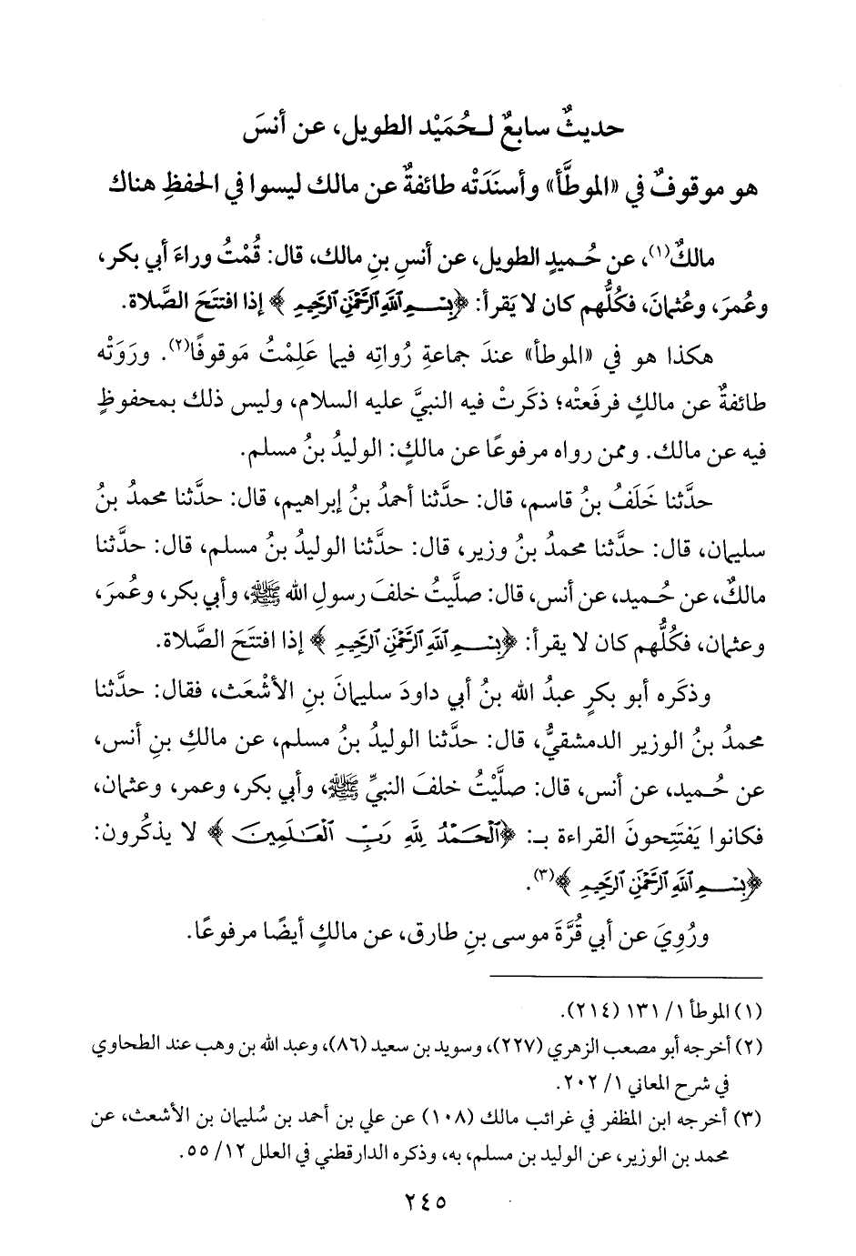وذكَره أبو بكرٍ عبدُ الله بنُ أبي داودَ سليمانَ بنِ الأشْعَث، فقال: حدَّثنا محمدُ بنُ الوزير الدمشقيُّ، قال: حدَّثنا الوليدُ بنُ مسلم، عن مالكِ بنِ أنس، عن حُميد، عن أنس، قال: صلَّيْتُ خلفَ النبيِّ - صلى الله عليه وسلم -، وأبي بكر، وعمر، وعثمان، فكانوا يَفتَتِحونَ القراءة بـ: {الْحَمْدُ لِلَّهِ رَبِّ الْعَالَمِينَ} لا يذكُرون: {بِسْمِ اللَّهِ الرَّحْمَنِ الرَّحِيمِ} (¬٣).