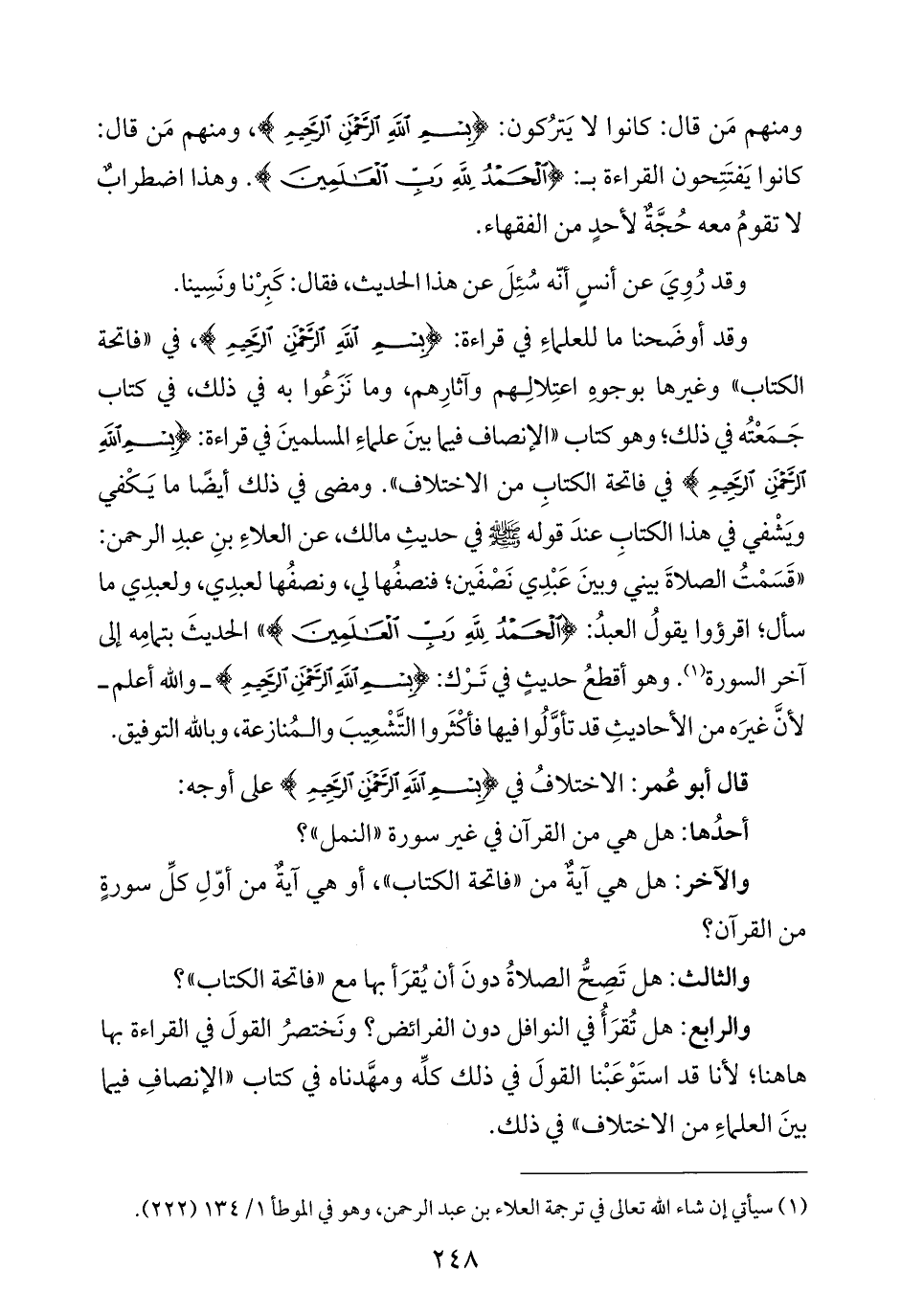 ومنهم مَن قال: كانوا لا يَترُكون: {بِسْمِ اللَّهِ الرَّحْمَنِ الرَّحِيمِ}، ومنهم مَن قال: كانوا يَفتَتِحون القراءة بـ: {الْحَمْدُ لِلَّهِ رَبِّ الْعَالَمِينَ}. وهذا اضطرابٌ لا تقومُ معه حُجَّةٌ لأحدٍ من الفقهاء.