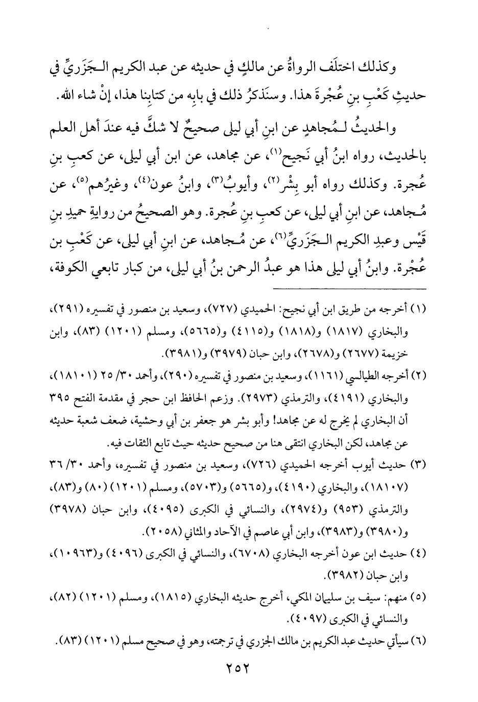 والحديثُ لمُجاهدٍ عن ابنِ أبي ليلى صحيح لا شكَّ فيه عندَ أهل العلم بالحديث، رواه ابنُ أبي نَجيح (¬١)، عن مجاهد، عن ابن أبي ليلى، عن كعبِ بنِ عُجرة. وكذلك رواه أبو بِشْر (¬٢)، وأيوبُ (¬٣)، وابنُ عون (¬٤)، وغيرُهم (¬٥)، عن مُجاهد، عن ابنِ أبي ليلى، عن كعبِ بنِ عُجرة. وهو الصحيحُ من روايةِ حميدِ بنِ قَيْس وعبدِ الكريم الجَزَريِّ (¬٦)، عن مُجاهد، عن ابنِ أبي ليلى، عن كَعْبِ بن عُجْرة. وابنُ أبي ليلى هذا هو عبدُ الرحمن بنُ أبي ليلى، من كبار تابعي الكوفة،