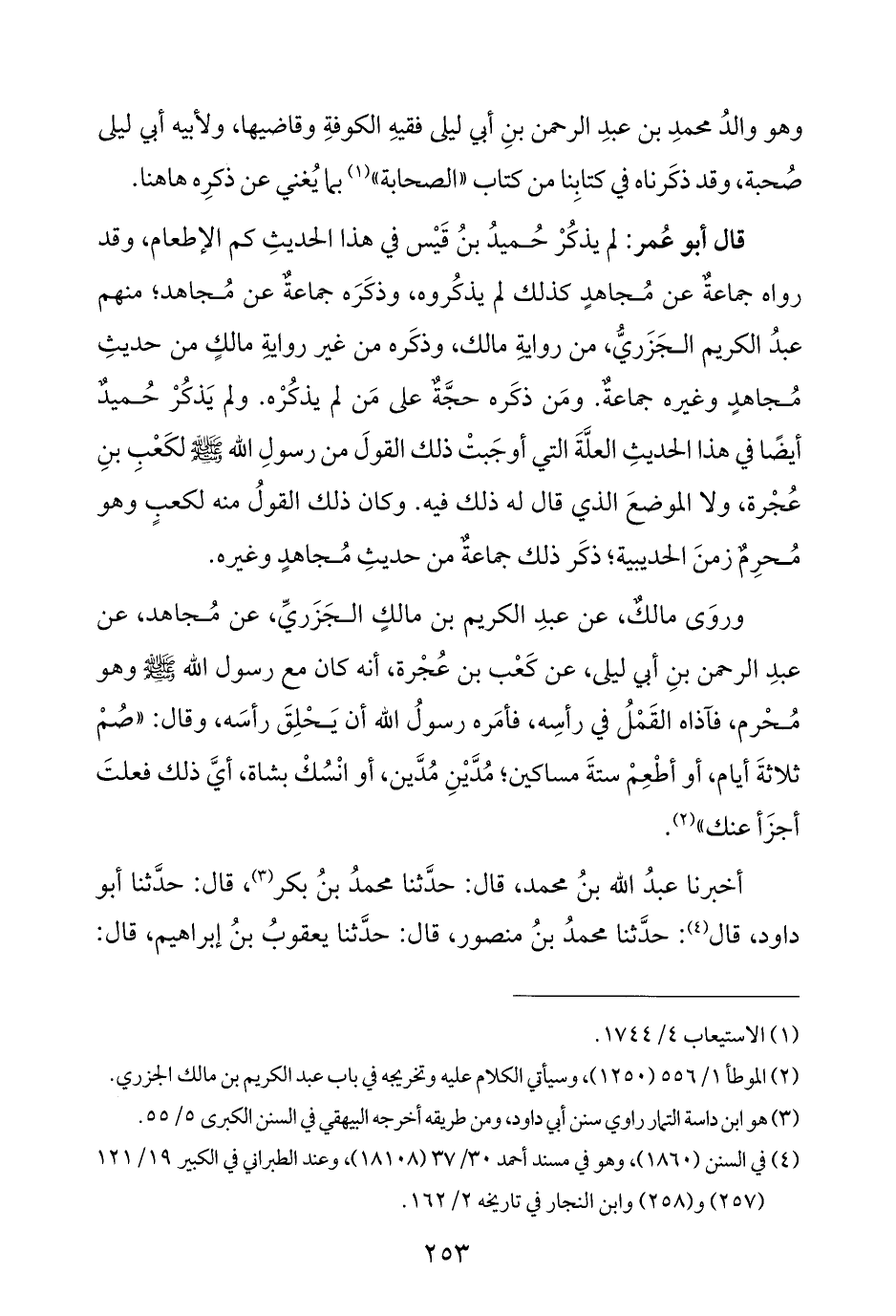قال أبو عُمر: لم يذكُرْ حُميدُ بنُ قَيْس في هذا الحديثِ كم الإطعام، وقد رواه جمماعةٌ عن مُجاهدٍ كذلك لم يذكُروه، وذكَرَه جماعةٌ عن مُجاهد؛ منهم عبدُ الكريم الجَزَريُّ، من روايةِ مالك، وذكَره من غير روايةِ مالكٍ من حديثِ مُجاهدٍ وغيره جماعةٌ. ومَن ذكَره حجَّةٌ على مَن لم يذكُرْه. ولم يَذكُرْ حُميدٌ أيضًا في هذا الحديثِ العلَّةَ التي أوجَبتْ ذلك القولَ من رسولِ الله - صلى الله عليه وسلم - لكَعْبِ بنِ عُجْرة، ولا الموضعَ الذي قال له ذلك فيه. وكان ذلك القولُ منه لكعبٍ وهو مُحرِمٌ زمنَ الحديبية؛ ذكَر ذلك جماعةٌ من حديثِ مُجاهدٍ وغيره.