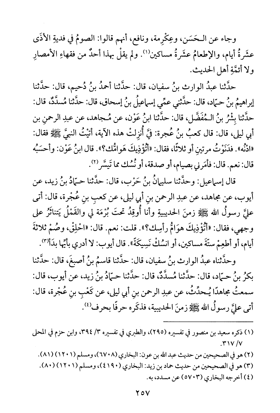 حدَّثنا عبدُ الوارث بنُ سفيان، قال: حدَّثنا أحمدُ بنُ دُحيم، قال: حدَّثنا إبراهيمُ بنُ حمّاد، قال: حدَّثني عمِّي إسماعيلُ بنُ إسحاق، قال: حدَّثنا مُسدَّدٌ، قال: حدَّثنا بِشْرُ بنُ المُفَضَّل، قال: حدَّثنا ابنُ عَوْن، عن مُجاهد، عن عبدِ الرحمنِ بن أبي ليلى، قال: قال كعبُ بنُ عُجرة: فيَّ أُنزِلتْ هذه الآية، أتيْتُ النبيَّ - صلى الله عليه وسلم - فقال: "ادْنُه". فدَنَوْتُ مرتينِ أو ثلاثًا، فقال: "أتُؤْذِيكَ هَوامُّك؟ ". قال ابنُ عَوْن: وأحسَبُه قال: نعم. قال: فأمَرني بصيام، أو صدقة، أو نُسُك مما تَيسَّر (¬٢).