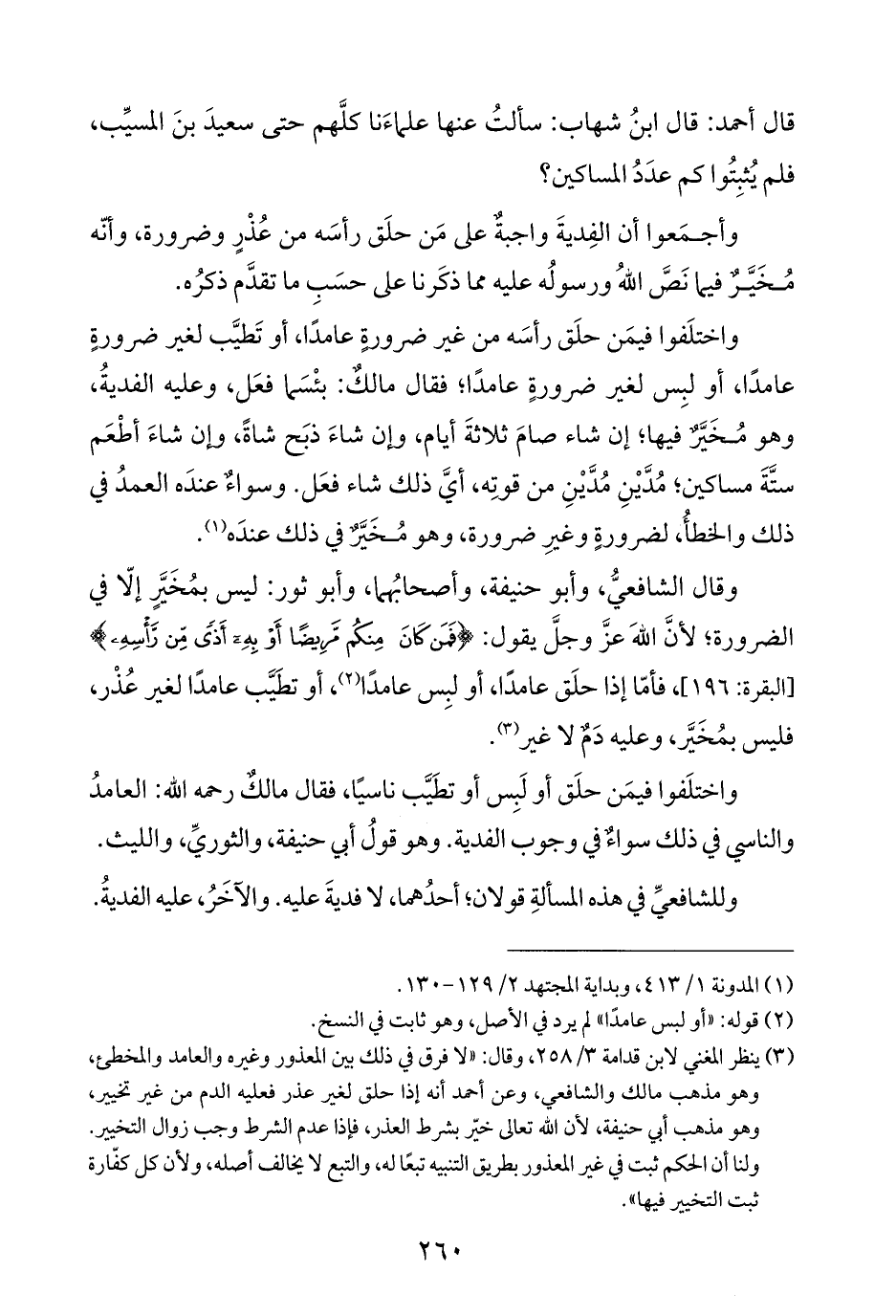 (¬٣) ينظر المغني لابن قدامة ٣/ ٢٥٨، وقال: "لا فرق في ذلك بين المعذور وغيره والعامد والمخطئ، وهو مذهب مالك والشافعي، وعن أحمد أنه إذا حلق لغير عذر فعليه الدم من غير تخيير، وهو مذهب أبي حنيفة، لأن الله تعالى خيّر بشرط العذر، فإذا عدم الشرط وجب زوال التخيير. ولنا أن الحكم ثبت في غير المعذور بطريق التنبيه تبعًا له، والتبع لا يخالف أصله، ولأن كل كفّارة ثبت التخيير فيها".
