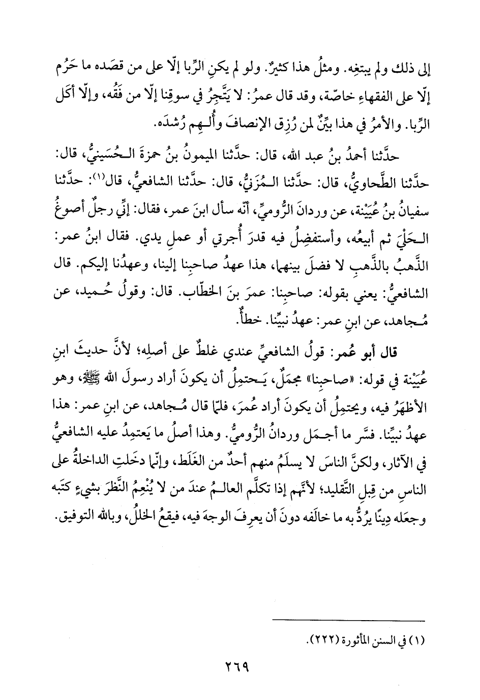 حدَّثنا أحمدُ بنُ عبد الله، قال: حدَّثنا الميمونُ بنُ حمزةَ الحُسَينيُّ، قال: حدَّثنا الطَّحاويُّ، قال: حدَّثنا المُزَنيُّ، قال: حدَّثنا الشافعيُّ، قال (¬١): حدَّثنا سفيانُ بنُ عُيَيْنة، عن وردانَ الرُّوميِّ، أنّه سأل ابنَ عمر، فقال: إنِّي رجلٌ أصوغُ الحَلْيَ ثم أبيعُه، وأستفضِلُ فيه قدرَ أُجرتي أو عملِ يدي. فقال ابنُ عمر: الذَّهبُ بالذَّهبِ لا فضلَ بينهما، هذا عهدُ صاحبِنا إلينا، وعهدُنا إليكم. قال الشافعيُّ: يعني بقوله: صاحبِنا: عمرَ بنَ الخطّاب. قال: وقولُ حُميد، عن مُجاهد، عن ابنِ عمر: عهدُ نبيِّنا. خطأٌ.