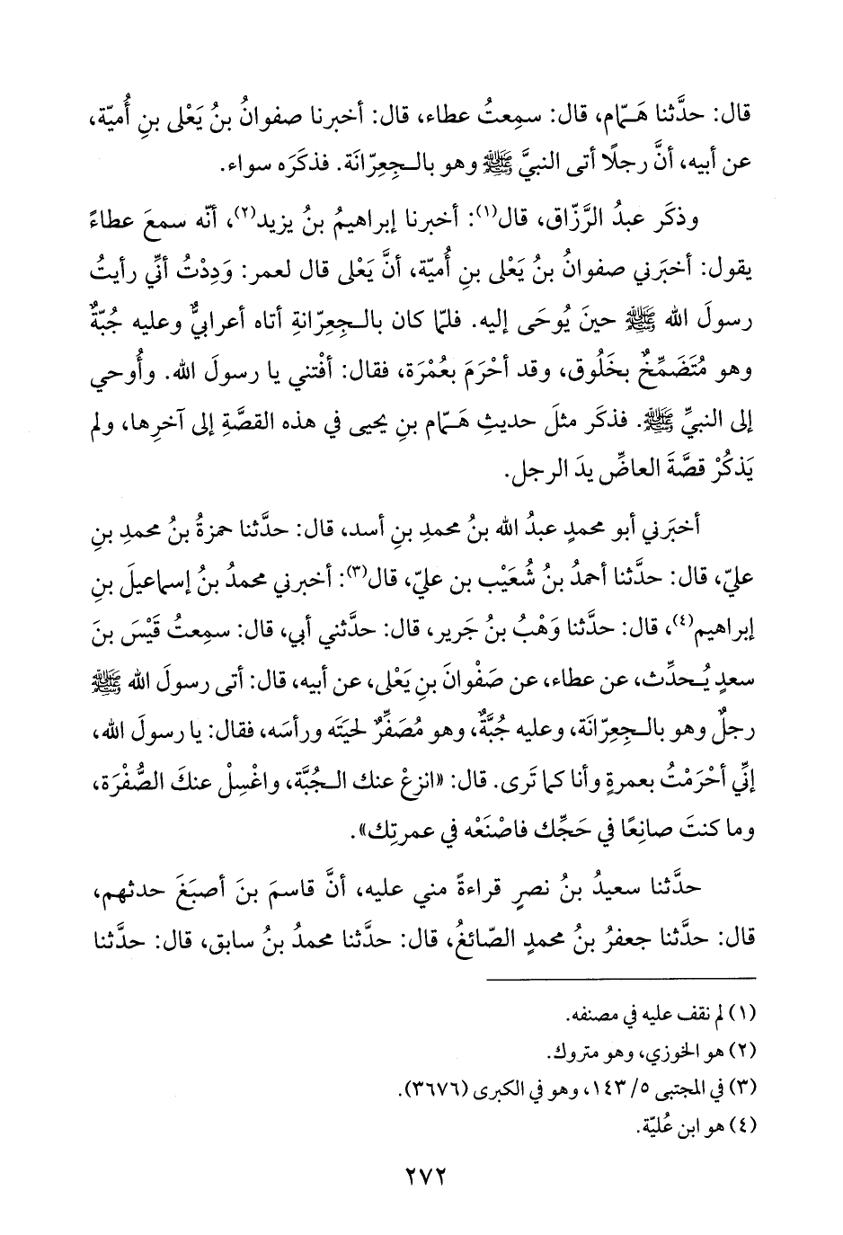 أخبَرني أبو محمدٍ عبدُ الله بنُ محمدِ بنِ أسد، قال: حدَّثنا حمزةُ بنُ محمدِ بنِ عليّ، قال: حدَّثنا أحمدُ بنُ شُعَيْب بن عليّ، قال (¬٣): أخبرني محمدُ بنُ إسماعيلَ بنِ إبراهيم (¬٤)، قال: حدَّثنا وَهْبُ بنُ جَرير، قال: حدَّثني أبي، قال: سمِعتُ قَيْسَ بنَ سعدٍ يُحدِّث، عن عطاء، عن صَفْوانَ بنِ يَعْلى، عن أبيه، قال: أتى رسولَ الله - صلى الله عليه وسلم - رجلٌ وهو بالجِعِرّانَة، وعليه جُبَّة، وهو مُصَفِّرٌ لحيَتَه ورأسَه، فقال: يا رسولَ الله، إنِّي أحْرَمْتُ بعمرةٌ وأنا كما تَرى. قال: "انزعْ عنك الجُبَّة، واغْسِلْ عنكَ الصُّفْرَة، وما كنتَ صانِعًا في حَجِّك فاصْنَعْه في عمرتِك".