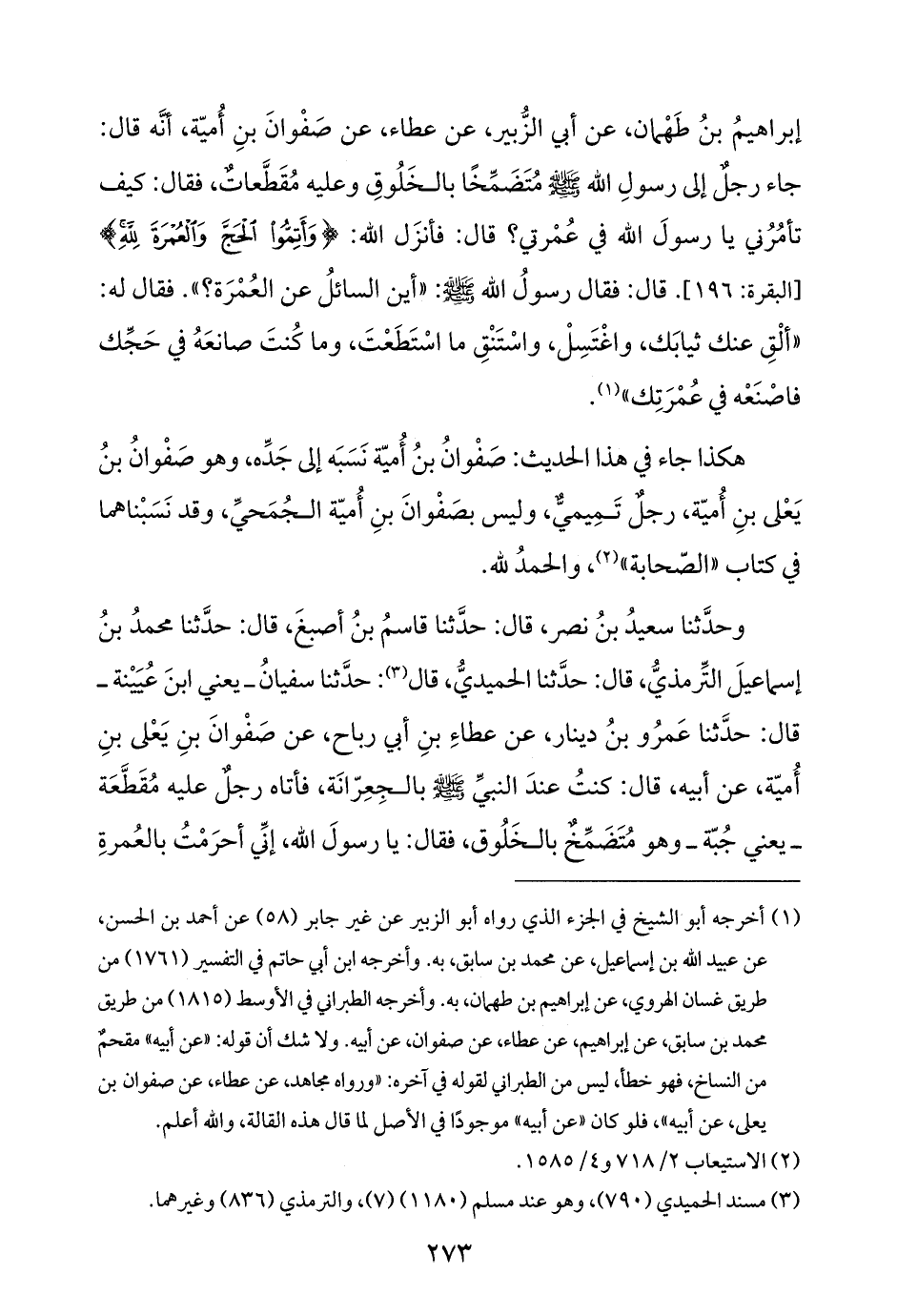 إبراهيمُ بنُ طَهْمان، عن أبي الزُّبير، عن عطاء، عن صَفْوانَ بنِ أُميّة، أنَّه قال: جاء رجل إلى رسولِ الله - صلى الله عليه وسلم - مُتَضَمِّخًا بالخَلُوقِ وعليه مُقَطَّعات، فقال: كيف تأمُرُني يا رسولَ الله في عُمْرتي؟ قال: فأنزَل الله: {وَأَتِمُّوا الْحَجَّ وَالْعُمْرَةَ لِلَّهِ} [البقرة: ١٩٦]. قال: فقال رسولُ الله - صلى الله عليه وسلم -:"أين السائلُ عن العُمْرَة؟ ". فقال له: "ألْقِ عنك ثيابَك، واغْتَسِلْ، واستَنْقِ ما اسْتَطَعْتَ، وما كُنتَ صانعَهُ في حَجِّك فاصْنَعْه في عُمْرَتِك" (¬١).