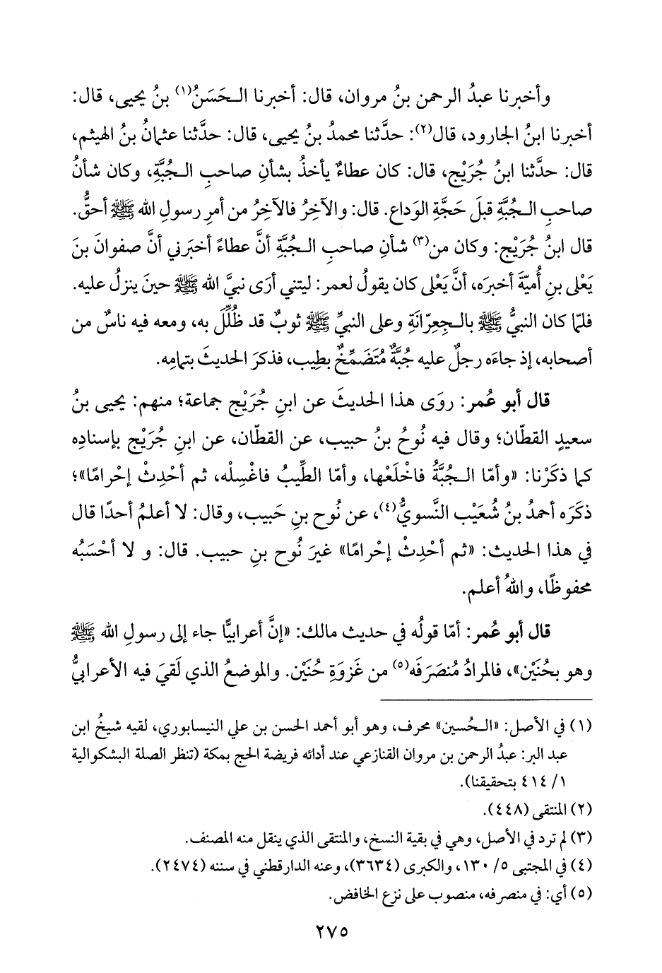 قال أبو عُمر: روَى هذا الحديثَ عن ابنِ جُرَيْج جماعة؛ منهم: يحيى بنُ سعيدٍ القطّان؛ وقال فيه نُوحُ بنُ حبيب، عن القطّان، عن ابنِ جُرَيْج بإسنادِه كما ذكَرْنا: "وأمّا الجُبَّةُ فاخْلَعْها، وأمّا الطِّيبُ فاغْسِلْه، ثم أحْدِثْ إحْرامًا"؛ ذكَرَه أحمدُ بنُ شُعَيْب النَّسويُّ (¬٤)، عن نُوح بنِ حَبيب، وقال: لا أعلمُ أحدًا قال في هذا الحديث: "ثم أحْدِثْ إحْرامًا" غيرَ نُوح بنِ حبيب. قال: ولا أحْسَبُه محفوظًا، واللهُ أعلم.