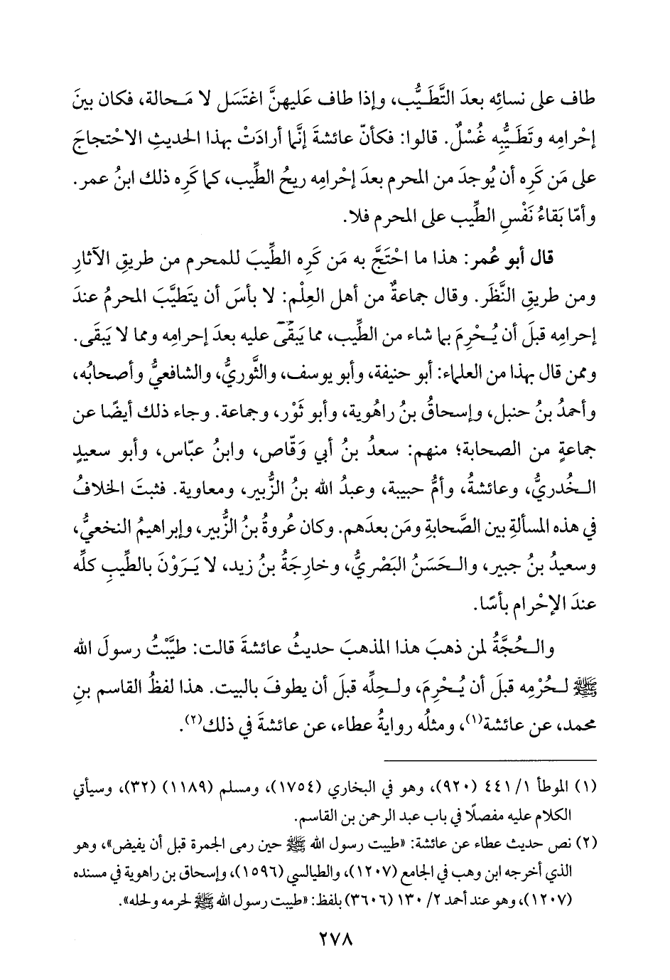 قال أبو عُمر: هذا ما احْتَجَّ به مَن كَرِه الطِّيبَ للمحرم من طريقِ الآثارِ ومن طريقِ النَّظَر. وقال جماعة من أهل العِلْم: لا بأسَ أن يتَطيَّبَ المحرمُ عندَ إحرامِه قبلَ أن يُحْرِمَ بما شاء من الطِّيب، مما يَبقى عليه بعدَ إحرامِه ومما لا يَبقَى. وممن قال بهذا من العلماء: أبو حنيفة، وأبو يوسف، والثَّوريُّ، والشافعيُّ وأصحابُه، وأحمدُ بنُ حنبل، وإسحاقُ بنُ راهُوية، وأبو ثَوْر، وجماعة. وجاء ذلك أيضًا عن جماعةٍ من الصحابة؛ منهم: سعدُ بنُ أبي وَقّاص، وابنُ عبّاس، وأبو سعيدٍ الخُدريُّ، وعائشةُ، وأمُّ حبيبة، وعبدُ الله بنُ الزُّبير، ومعاوية. فثبتَ الخلافُ في هذه المسألةِ بين الصَّحابةِ ومَن بعدَهم. وكان عُروةُ بنُ الزُّبير، وإبراهيمُ النخعيُّ، وسعيدُ بنُ جبير، والحَسَنُ البَصْريُّ، وخارِجَةُ بنُ زيد، لا يَرَوْنَ بالطِّيبِ كلِّه عندَ الإحْرام بأسًا.