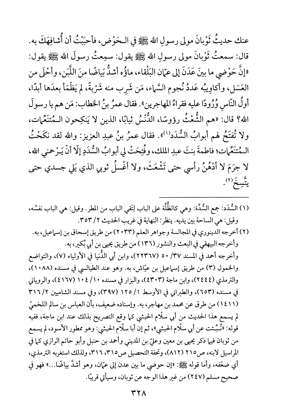عنك حديثُ ثَوْبانَ مولى رسولِ الله - صلي الله عليه وسلم - في الحَوْض، فأحبَبْتُ أن أُشافِهَكَ به. قال: سمعتُ ثَوْبانَ مولى رسولِ الله - صلي الله عليه وسلم - يقول: سمِعتُ رسولَ الله - صلى الله عليه وسلم - يقول: "إنَّ حَوْضي ما بينَ عَدَنَ إلى عمّان البَلْقاء، ماؤُه أشدُّ بَياضًا منَ اللَّبَن، وأحْلَى من العَسَل، وأكاوِيبُه عَددُ نُجوم السَّماء، مَن شَرِب منه شَرْبةً، لم يَظْمَأ بعدَها أبدًا، أولُ النّاسِ وُرُودًا عليه فقراءُ المهاجرين". فقال عمرُ بنُ الخطاب: مَن هم يا رسولَ الله؟ قال: "هم الشُّعْثُ رؤوسًا، الدُّنْسُ ثيابًا، الذين لا يَنكِحون المُتنَعِّمات، ولا تُفتَحُ لهم أبوابُ السُّدَد (¬١) ". فقال عمرُ بنُ عبدِ العزيز: والله لقد نكَحْتُ المُتنَعِّمات؛ فاطمةَ بنتَ عبدِ الملك، وفُتِحَتْ لي أبوابُ السُّدَدِ إلّا أنْ يَرْحمني الله، لا جرَمَ لا أدْهُنُ رأسي حتى تَشْعَثَ، ولا أغْسلُ ثوبي الذي يَلي جسدي حتى يتَّسِخَ (¬٢).