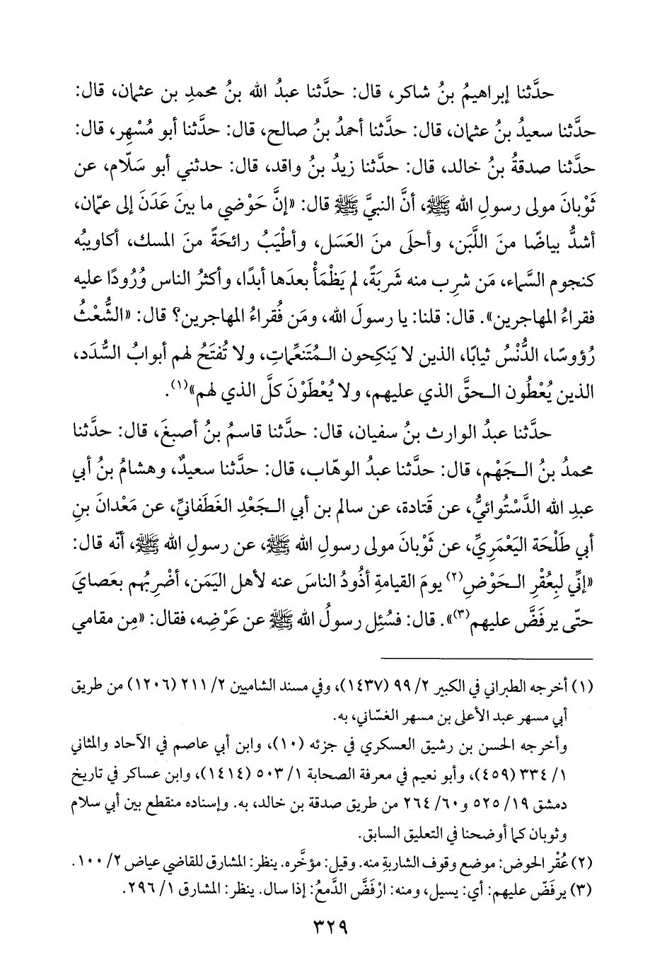 حدَّثنا إبراهيمُ بنُ شاكر، قال: حدَّثنا عبدُ الله بنُ محمدِ بن عثمان، قال: حدَّثنا سعيدُ بنُ عثمان، قال: حدَّثنا أحمدُ بنُ صالح، قال: حدَّثنا أبو مُسْهِر، قال: حدَّثنا صدقةُ بنُ خالد، قال: حدَّثنا زيدُ بنُ واقد، قال: حدثني أبو سَلّام، عن ثَوْبانَ مولى رسولِ الله - صلي الله عليه وسلم -، أنَّ النبيَّ - صلى الله عليه وسلم - قال: "إنَّ حَوْضي ما بينَ عَدَنَ إلى عمّان، أشدُّ بياضًا منَ اللَّبَن، وأحلَى منَ العَسَل، وأطْيَبُ رائحَةً منَ المسك، أكاويبُه كنجوم السَّماء، مَن شرِب منه شربَةً، لم يَظْمَأْ بعدَها أبدًا، وأكثرُ الناس وُرُودًا عليه فقراءُ المهاجرين". قال: قلنا: يا رسولَ الله، ومَن فُقراءُ المهاجرين؟ قال: "الشُّعْثُ رُؤوسًا، الدُّنْسُ ثيابًا، الذين لا يَنكِحون المُتَنعِّماتِ، ولا تُفتَحُ لهم أبوابُ السُّدَد، الذين يُعْطُون الحقَّ الذي عليهم، ولا يُعْطَوْنَ كلَّ الذي لهم" (¬١).