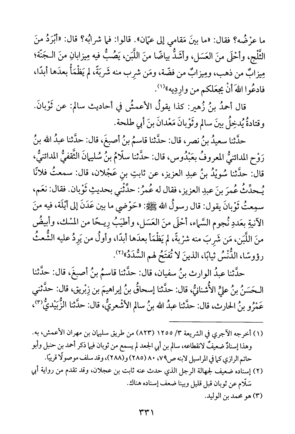 حدَّثنا سعيدُ بنُ نصر، قال: حدَّثنا قاسمُ بنُ أصبغَ، قال: حدَّثنا عبدُ الله بنُ رَوْح المدائنيُّ المعروفُ بعَبْدُوس، قال: حدَّثنا سلّامُ بنُ سُليمانَ الثَّقفيُّ المدائنيُّ، قال: حدَّثنا سُويْدُ بنُ عبدِ العزيز، عن ثابتِ بنِ عَجْلان، قال: سمعتُ فلانًا يُحدِّثُ عُمرَ بنَ عبدِ العزيز، فقال له عُمرُ: حدِّثني بحديثِ ثَوْبان. فقال: نعَم، سمِعتُ ثَوْبانَ يقول: قال رسولُ الله - صلي الله عليه وسلم -: "حَوْضي ما بين عَدَنَ إلى أيْلَة، فيه منَ الآنيةِ بعَددِ نُجوم السَّماء، أحْلَى منَ العَسَل، وأطيَبُ رِيحًا من المسْك، وأبيضُ منَ اللَّبَن، مَن شَرِبَ منه شرْبةً، لم يَظْمَأ بعدَها أبدًا، وأولُ من يَرِدُ عليه الشُّعثُ رؤوسًا، الدُّنْسُ ثيابًا، الذينَ لا تُفتَحُ لهم السُّدَدُ" (¬٢).