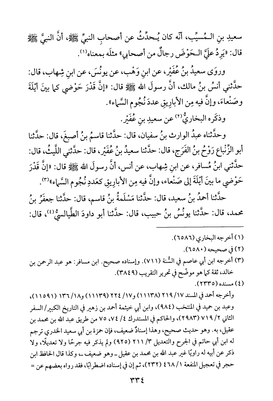 وروَى سعيدُ بنُ عُفَيْر، عن ابنِ وَهْب، عن يونُسَ، عن ابنِ شِهاب، قال: حدَّثني أنسُ بنُ مالك، أنَّ رسولَ الله - صلى الله عليه وسلم - قال: "إنَّ قَدْرَ حَوْضي كما بينَ أيْلَةَ وصَنْعاءَ، وإنَّ فيه مِن الأبارِيقِ عددَ نُجُوم السَّماء".
