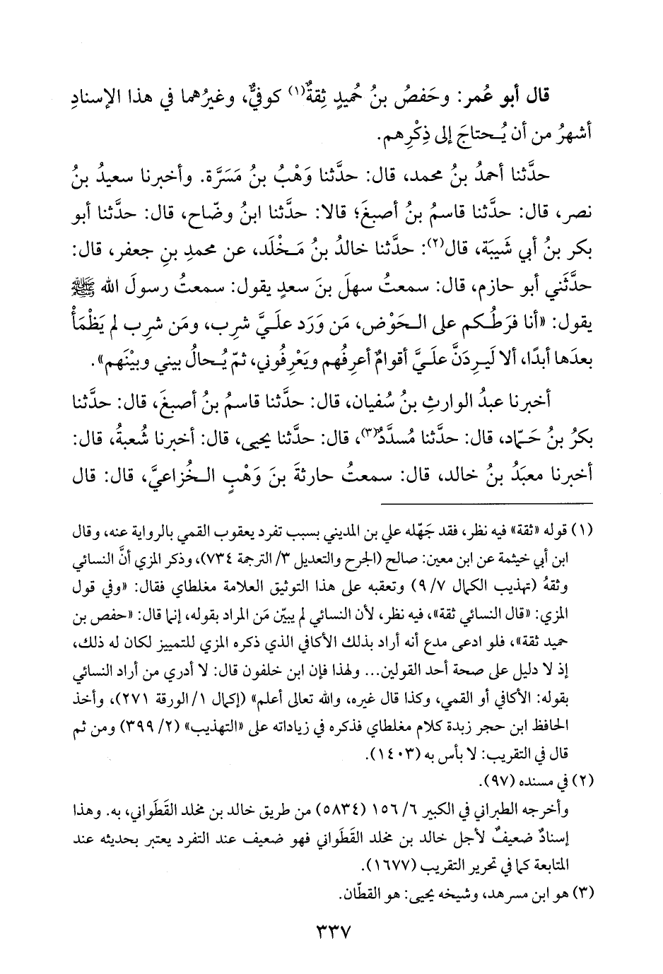 حدَّثنا أحمدُ بنُ محمد، قال: حدَّثنا وَهْبُ بنُ مَسَرَّة. وأخبرنا سعيدُ بنُ نصر، قال: حدَّثنا قاسمُ بنُ أصبغَ؛ قالا: حدَّثنا ابنُ وضّاح، قال: حدَّثنا أبو بكر بنُ أبي شَيبَة، قال (¬٢): حدَّثنا خالدُ بنُ مَخْلَد، عن محمدِ بنِ جعفر، قال: حدَّثَني أبو حازم، قال: سمعتُ سهلَ بنَ سعدٍ يقول: سمعتُ رسولَ الله - صلى الله عليه وسلم - يقول: "أنا فرَطُكم على الحَوْض، مَن وَرَد علَيَّ شرِب، ومَن شرِب لم يَظْمَأْ بعدَها أبدًا، ألا لَيرِدَنَّ علَيَّ أقوامٌ أعرِفُهم وَيعْرِفُوني، ثمّ يُحالُ بيني وبيْنَهم".