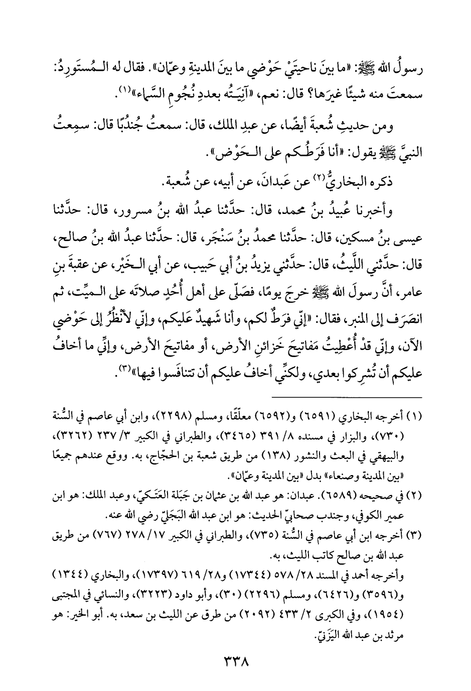 وأخبرنا عُبيدُ بنُ محمد، قال: حدَّثنا عبدُ الله بنُ مسرور، قال: حدَّثنا عيسى بنُ مسكين، قال: حدَّثنا محمدُ بنُ سَنْجَر، قال: حدَّثنا عبدُ الله بنُ صالح، قال: حدَّثني اللَّيثُ، قال: حدَّثني يزيدُ بنُ أبي حَبيب، عن أبي الخَيْر، عن عقبةَ بنِ عامر، أنَّ رسولَ الله - صلى الله عليه وسلم - خرجَ يومًا، فصَلّى على أهل أُحُدٍ صلاتَه على الميِّت، ثم انصَرَف إلى المنبر، فقال: "إنِّي فرَطٌ لكم، وأنا شَهيدٌ عَليكم، وإنِّي لأنْظُرُ إلى حَوْضي الآن، وإنِّي قدْ أُعْطِيتُ مَفاتيحَ خَزائنِ الأرض، أو مفاتيحَ الأرض، وإنِّي ما أخافُ عليكم أن تُشرِكوا بعدي، ولكنِّي أخافُ عليكم أن تتنافَسوا فيها" (¬٣).