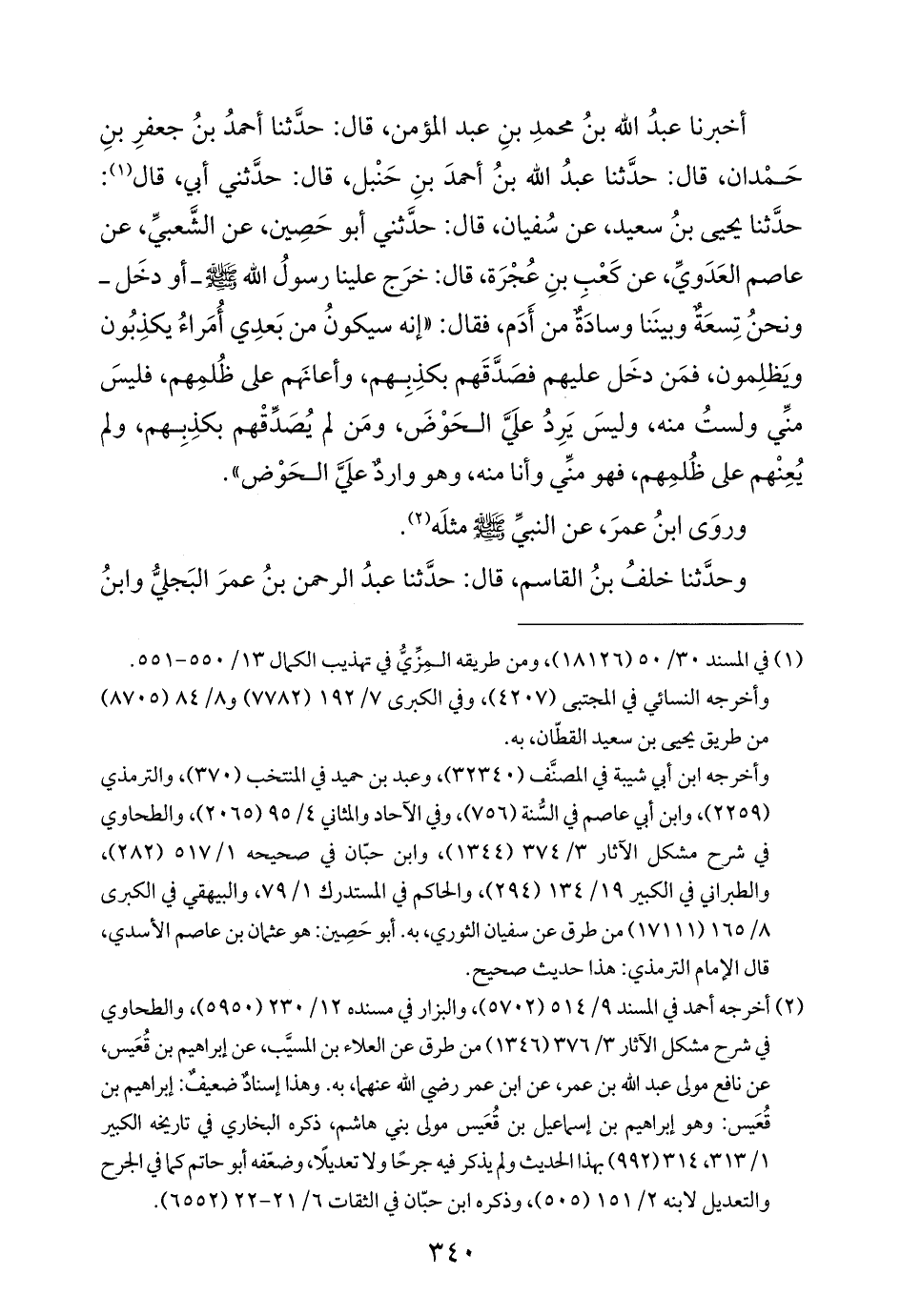 أخبرنا عبدُ الله بنُ محمدِ بنِ عبد المؤمن، قال: حدَّثنا أحمدُ بنُ جعفرِ بنِ حَمْدان، قال: حدَّثنا عبدُ الله بنُ أحمدَ بنِ حَنْبل، قال: حدَّثني أبي، قال (¬١): حدَّثنا يحيى بنُ سعيد، عن سُفيان، قال: حدَّثني أبو حَصِين، عن الشَّعبيِّ، عن عاصم العَدَويِّ، عن كَعْب بنِ عُجْرَة، قال: خرَج علينا رسولُ الله - صلي الله عليه وسلم - أو دخَل - ونحنُ تِسعَةٌ وبينَنا وسادَةٌ من أَدَم، فقال: "إنه سيكونُ من بَعدِي أُمَراءُ يكذِبُون ويَظلِمون، فمَن دخَل عليهم فصَدَّقَهم بكذِبِهم، وأعانَهم على ظُلمِهم، فليسَ منِّي ولستُ منه، وليسَ يَرِدُ علَيَّ الحَوْضَ، ومَن لم يُصَدِّقْهم بكذِبِهم، ولم يُعِنْهم على ظُلمِهم، فهو منِّي وأنا منه، وهو واردٌ علَيَّ الحَوْض".