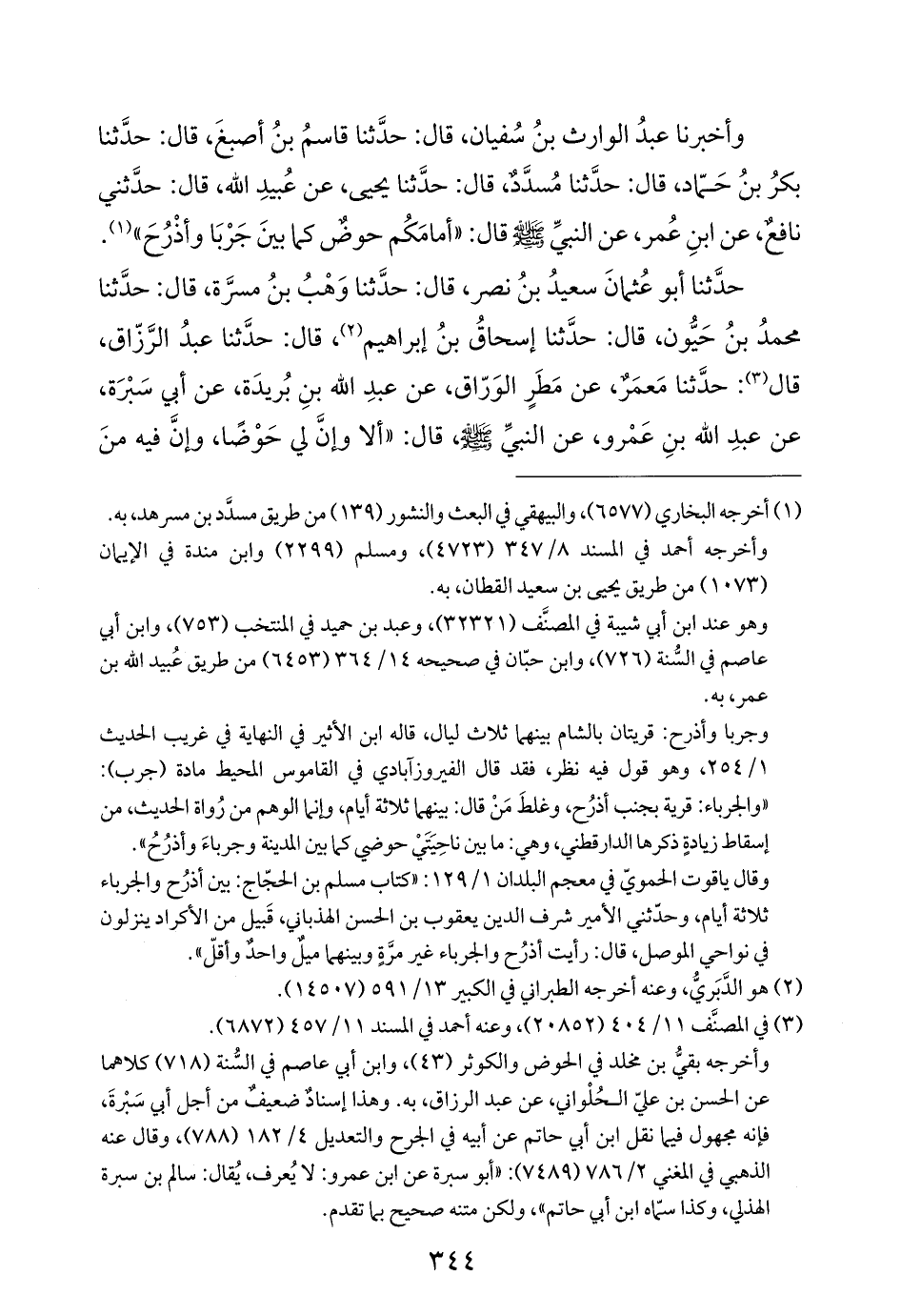 وأخبرنا عبدُ الوارث بنُ سفيان، قال: حدَّثنا قاسمُ بنُ أصبغَ، قال: حدَّثنا بكرُ بنُ حَمّاد، قال: حدَّثنا مُسدَّدٌ، قال: حدَّثنا يحيى، عن عُبيدِ الله، قال: حدَّثني نافعٌ، عن ابنِ عُمر، عن النبيِّ - صلى الله عليه وسلم - قال: "أمامَكُم حوض كما بينَ جَرْبَا وأذْرُحَ" (¬١).