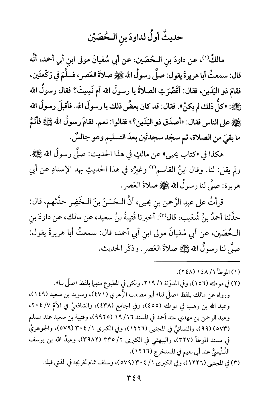 مالكٌ (¬١)، عن داودَ بنِ الحُصَين، عن أبي سُفيانَ مولى ابنِ أبي أحمد، أنَّه قال: سمعتُ أبا هريرةَ يقول: صلَّى رسولُ الله - صلى الله عليه وسلم - صلاةَ العَصر، فسلَّمَ في رَكْعتَين، فقامَ ذو اليَدَين، فقال: أقَصرَتِ الصلاةُ يا رسولَ الله أم نَسِيتَ؟ فقال رسولُ الله - صلى الله عليه وسلم -: "كلُّ ذلك لم يكنْ". فقال: قد كان بعضُ ذلك يا رسولَ الله. فأقبلَ رسولُ الله - صلى الله عليه وسلم - على الناس فقال: "أصدَق ذو اليَدَين؟ " فقالوا: نعم. فقامَ رسولُ الله - صلى الله عليه وسلم - فأتَمَّ ما بقيَ من الصلاة، ثم سجَد سجدتَين بعدَ التسليم وهو جالسٌ.