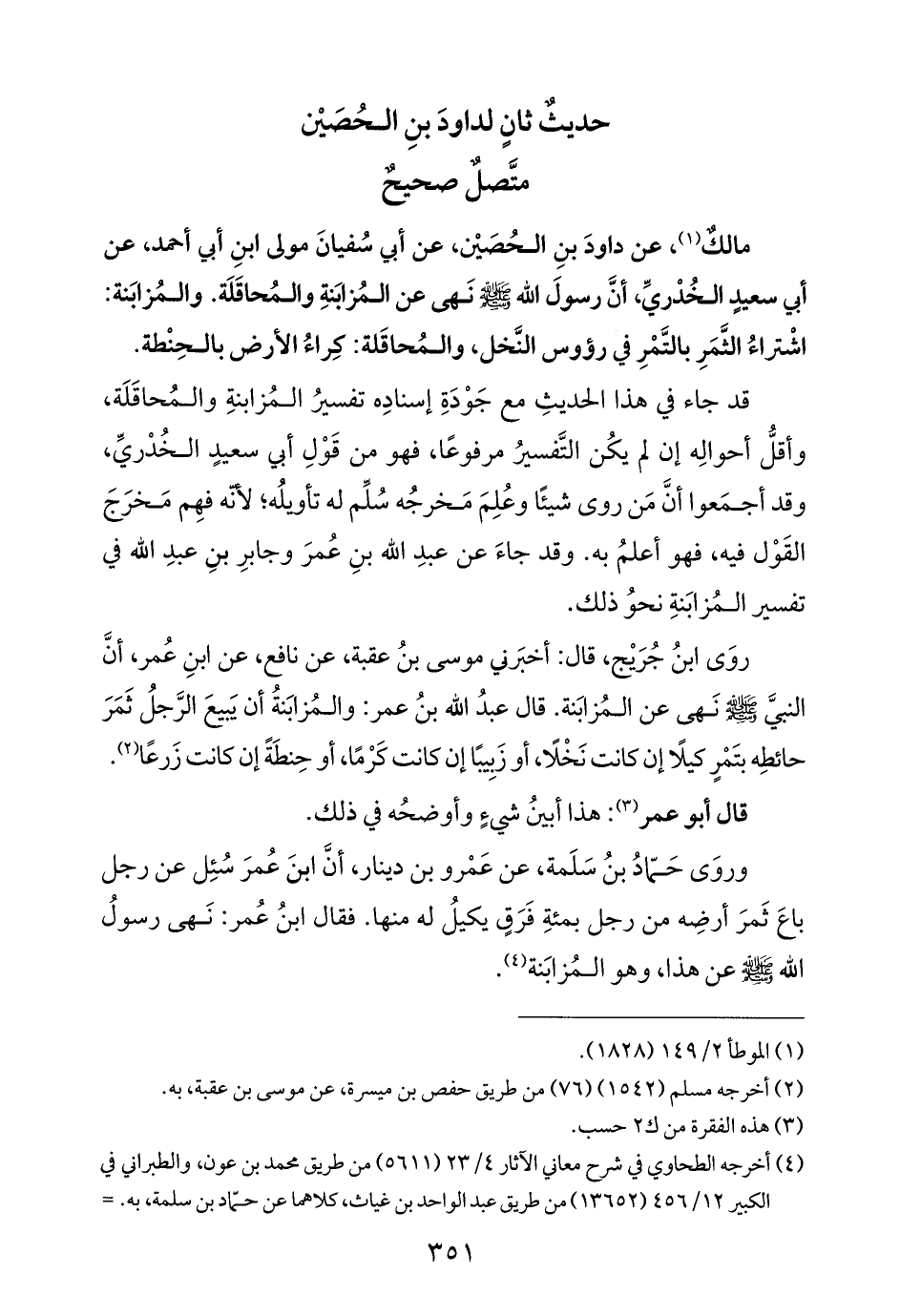 مالكٌ (¬١)، عن داودَ بنِ الحُصَيْن، عن أبى سُفيانَ مولى ابنِ أبي أحمد، عن أبي سعيدٍ الخُدْريِّ، أنَّ رسولَ الله - صلى الله عليه وسلم - نَهى عن المُزابَنةِ والمُحاقَلَة. والمُزابَنة: اشْتراءُ الثَّمَرِ بالتَّمْرِ في رؤوس النَّخل، والمُحاقَلة: كراءُ الأرض بالحِنْطة.