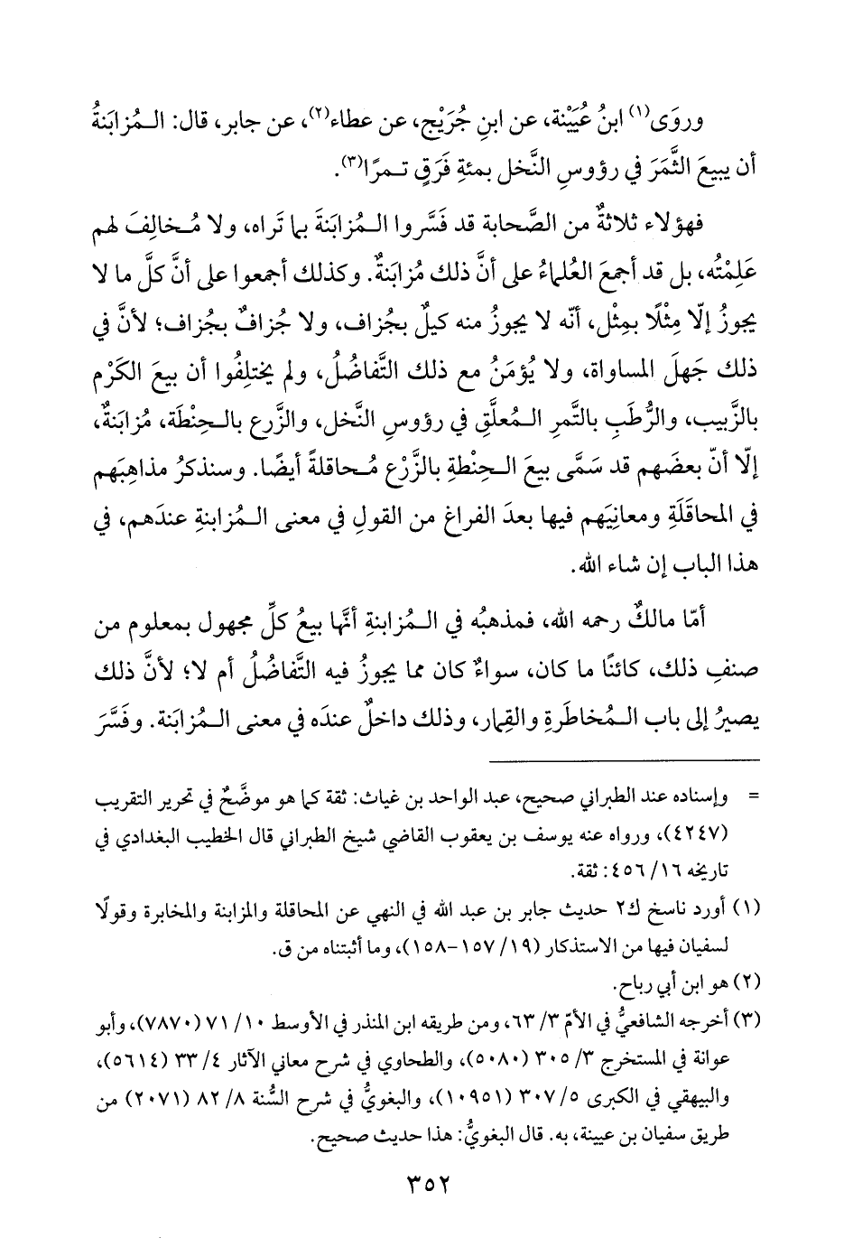 وروَى (¬١) ابنُ عُيَيْنة، عن ابنِ جُرَيْج، عن عطاء (¬٢)، عن جابر، قال: المُزابَنةُ أن يبيعَ الثَّمَرَ في رؤوسِ النَّخل بمئةِ فَرَقٍ تمرًا (¬٣).