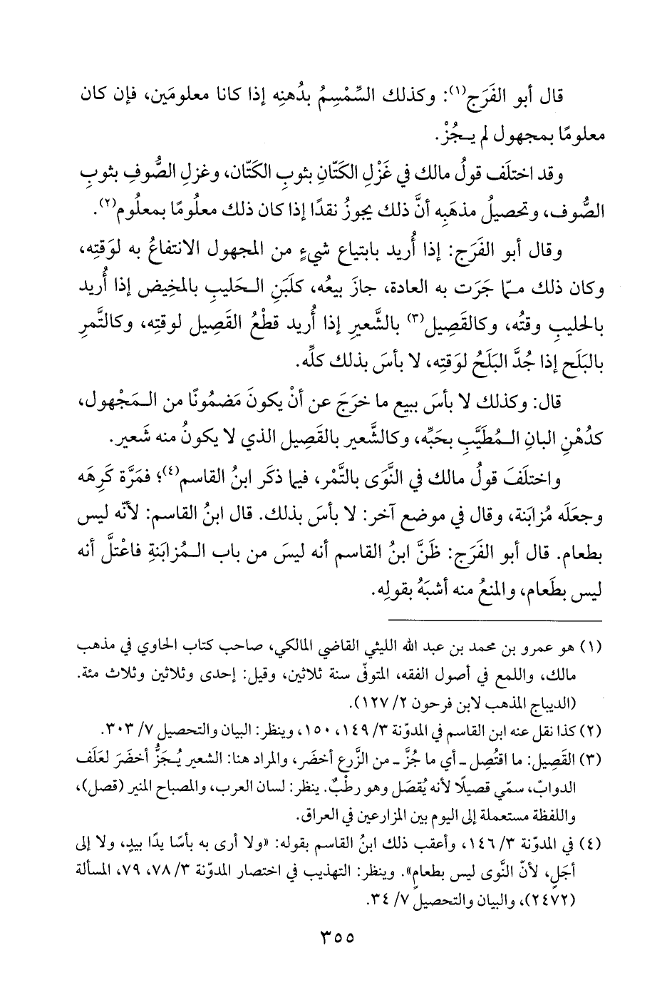 وقال أبو الفَرَج: إذا أُريد بابتياع شيءٍ من المجهول الانتفاعُ به لوَقتِه، وكان ذلك ممّا جَرَت به العادة، جازَ بيعُه، كلَبَنِ الحَليبِ بالمخِيض إذا أُريد بالحليبِ وقتُه، وكالقَصِيل (¬٣) بالشَّعيرِ إذا أُريد قطْعُ القَصِيل لوقتِه، وكالتَّمرِ بالبَلَح إذا جُدَّ البَلَحُ لوَقتِه، لا بأسَ بذلك كلِّه.
