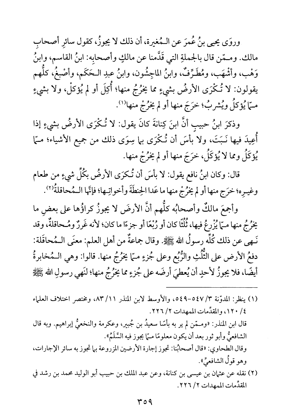 وأجمعَ مالكٌ وأصحابُه كلُّهم أنَّ الأرضَ لا يجوزُ كراؤُها على بعضِ ما يخرُجُ منها ممّا يُزْرعُ فيها، ثُلُثًا كان أو رُبْعًا أو جزءًا ما كان؛ لأنه غَررٌ ومُحاقلةٌ، وقد نَهى عن ذلك كُلِّه رسولُ الله - صلى الله عليه وسلم -. وقال جماعةٌ من أهل العلم: معنَى المُحاقَلة: دفعُ الأرض على الثُّلثِ والرُّبُع وعلى جُزءٍ ممّا يخرُجُ منها. قالوا: وهي المُخابرةُ أيضًا، فلا يجوزُ لأحدٍ أن يُعطيَ أرضَه على جُزءٍ مما يخرُجُ منها؛ لنَهي رسولِ الله - صلى الله عليه وسلم -