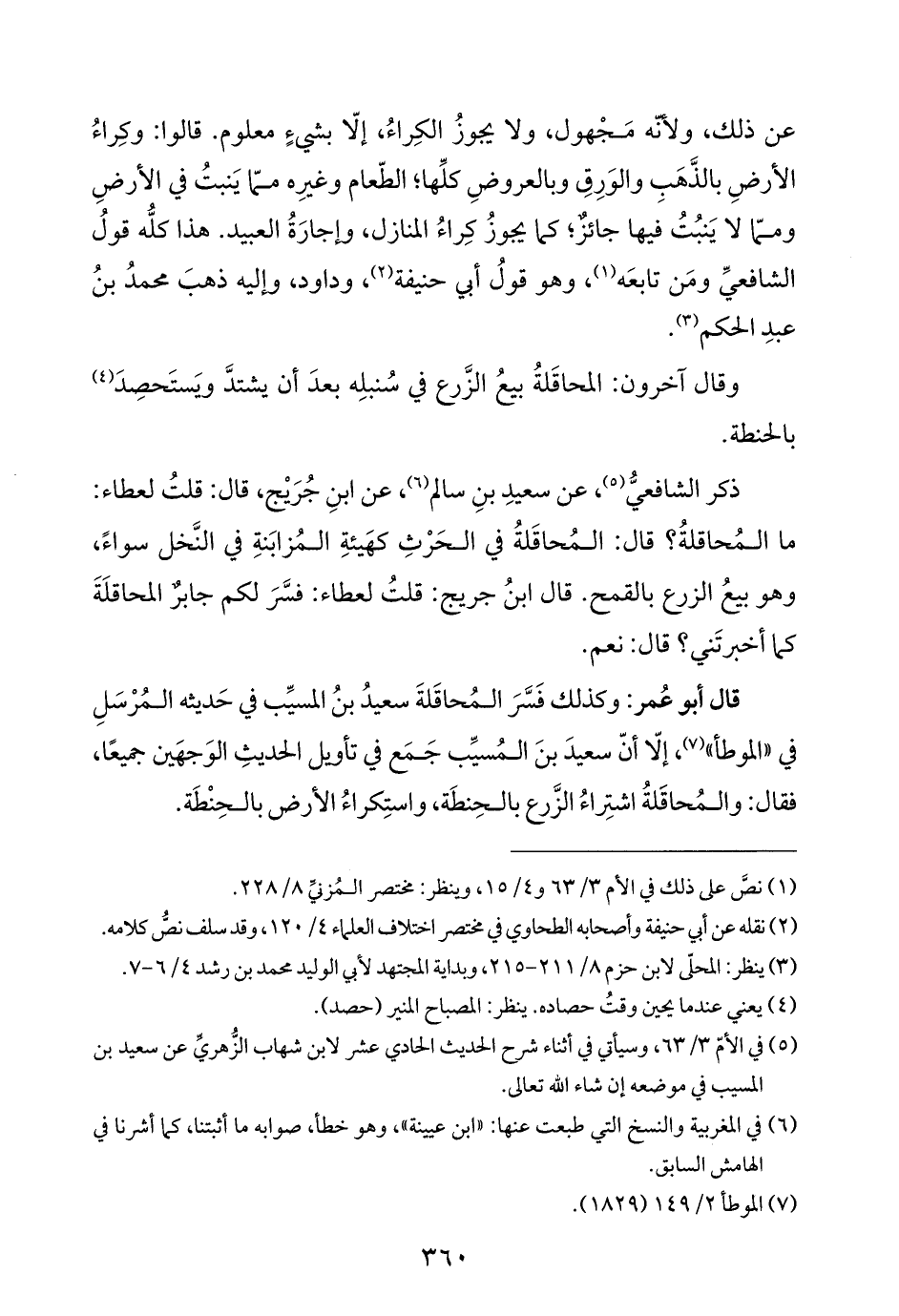 قال أبو عُمر: وكذلك فَسَّرَ المُحاقَلةَ سعيدُ بنُ المسيِّب في حَديثه المُرْسَلِ في "الموطأ" (¬٧)، إلّا أنّ سعيدَ بنَ المُسيِّب جَمَع في تأويل الحديثِ الوَجهَين جميعًا، فقال: والمُحاقَلةُ اشتِراءُ الزَّرع بالحِنطَة، واستِكراءُ الأرض بالحِنْطَة.